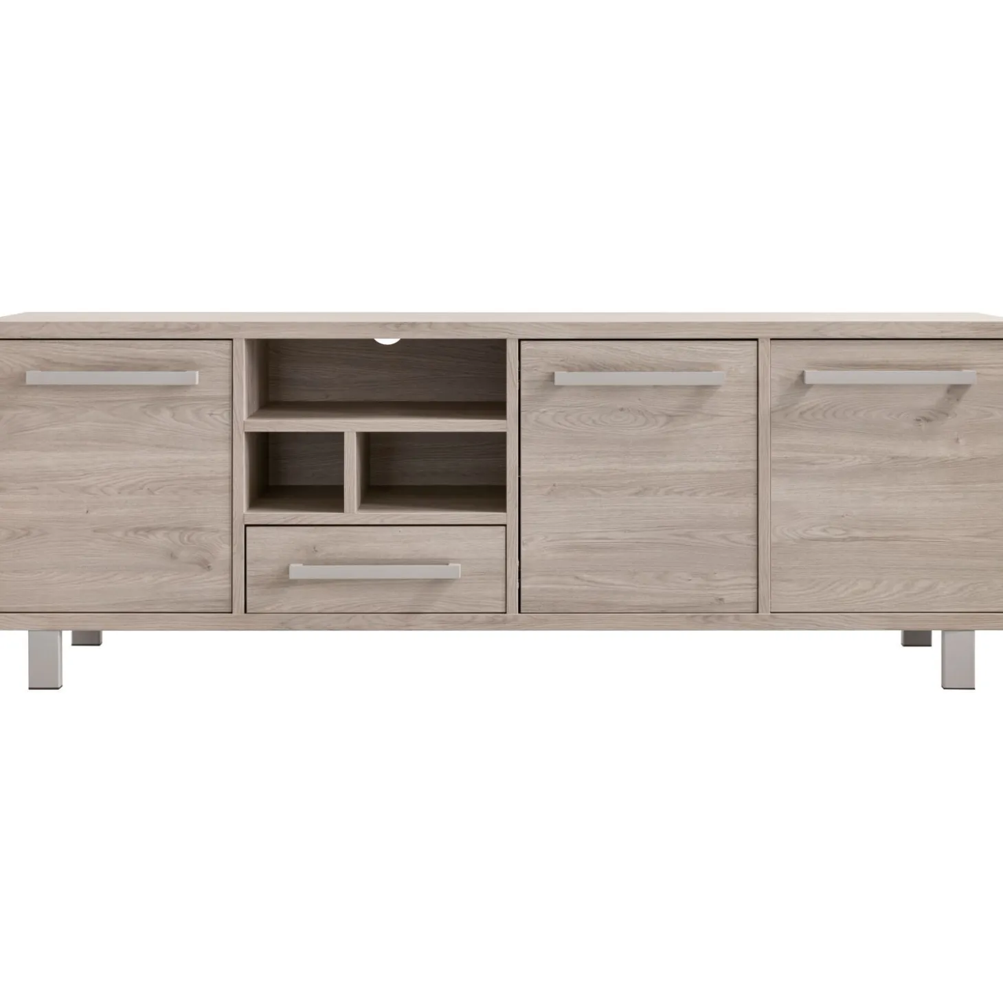 | Uitvoering | Uitgevoerd in de kleur grey oak met metalen handgrepen en poten in de kleur stone grey, met 3 deuren, 1 lade en 3 open vakken. |