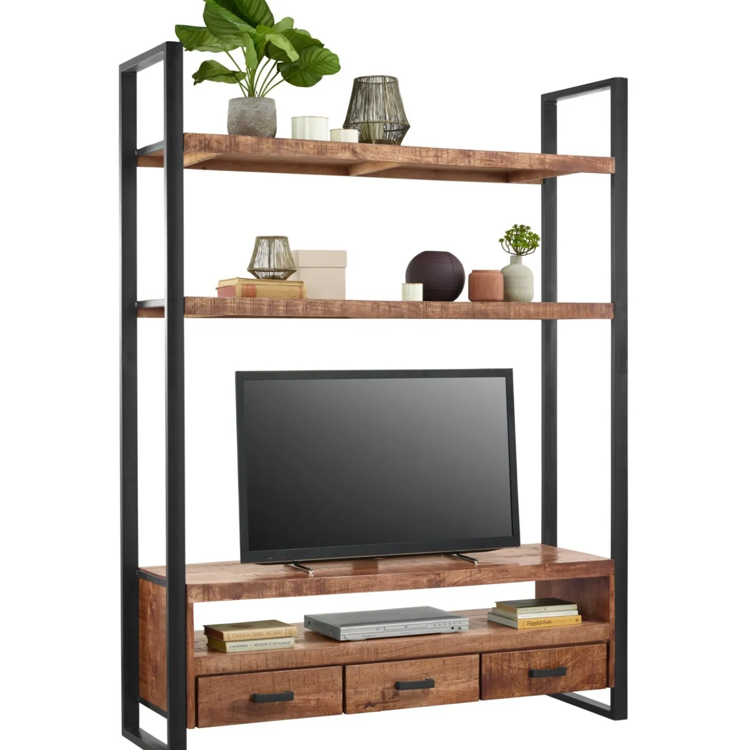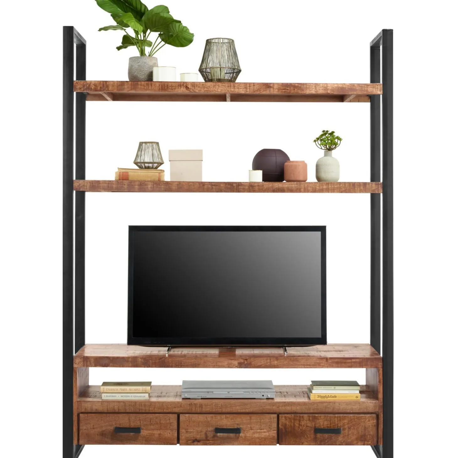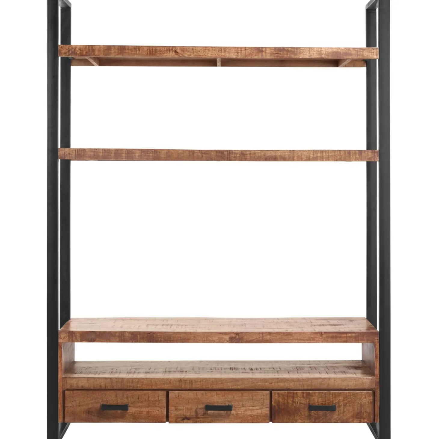 | Uitvoering | Uitgevoerd in mangohout in de kleur new weather barn met zwart metalen frame met 3 laden en 4 open vakken. |