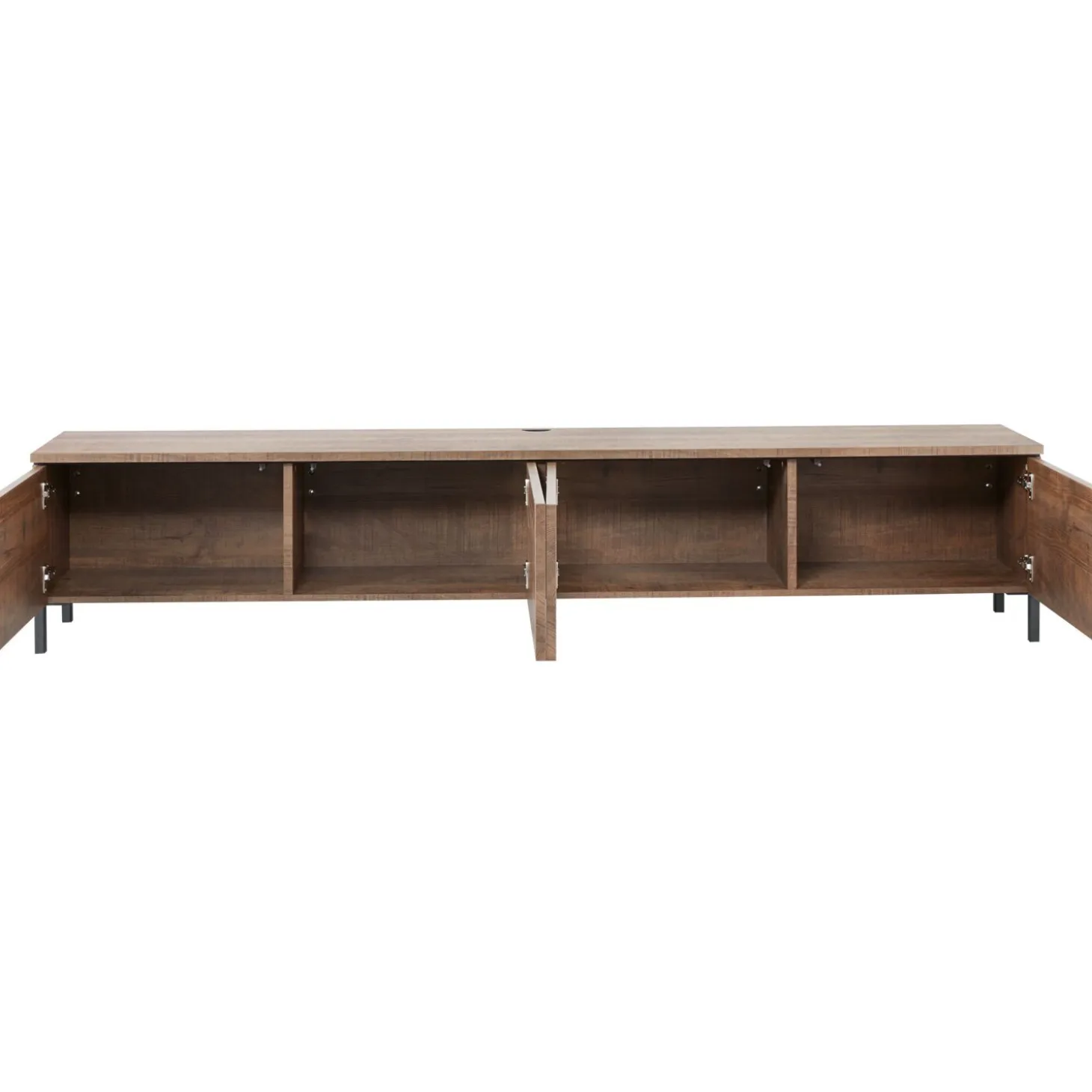 Dit TV-meubel heeft een moderne, elegante uitstraling door het warme mango decor en de rechte, ranke vorm. Het biedt royale opbergmogelijkheden door de 4 deuren. Dankzij het softclose-mechanisme sluiten de deuren geruisloos. Je opent de greeploze deuren door te drukken op het deurtje. Het TV-meubel is aan de achterzijde voorzien van een opening voor het doorvoeren van de kabels. Deze uitvoering is voorzien van zwart metalen pootjes en wordt staand geplaatst.