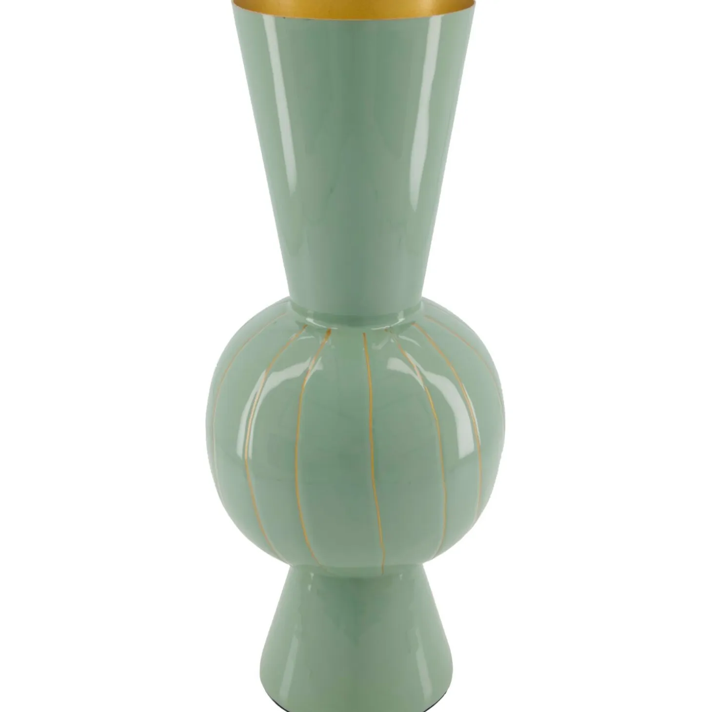 Deze elegante lichtblauwe vaas met een subtiele groenige tint heeft een unieke ronde vorm: smal onderaan, een speelse bolling in het midden en bovenaan weer sierlijk rond. Het zachte kleurenspel geeft een frisse en moderne uitstraling. Perfect als decoratief object of gevuld met een paar losse bloemen of takken.