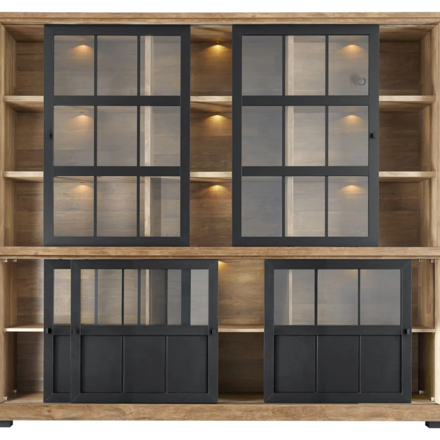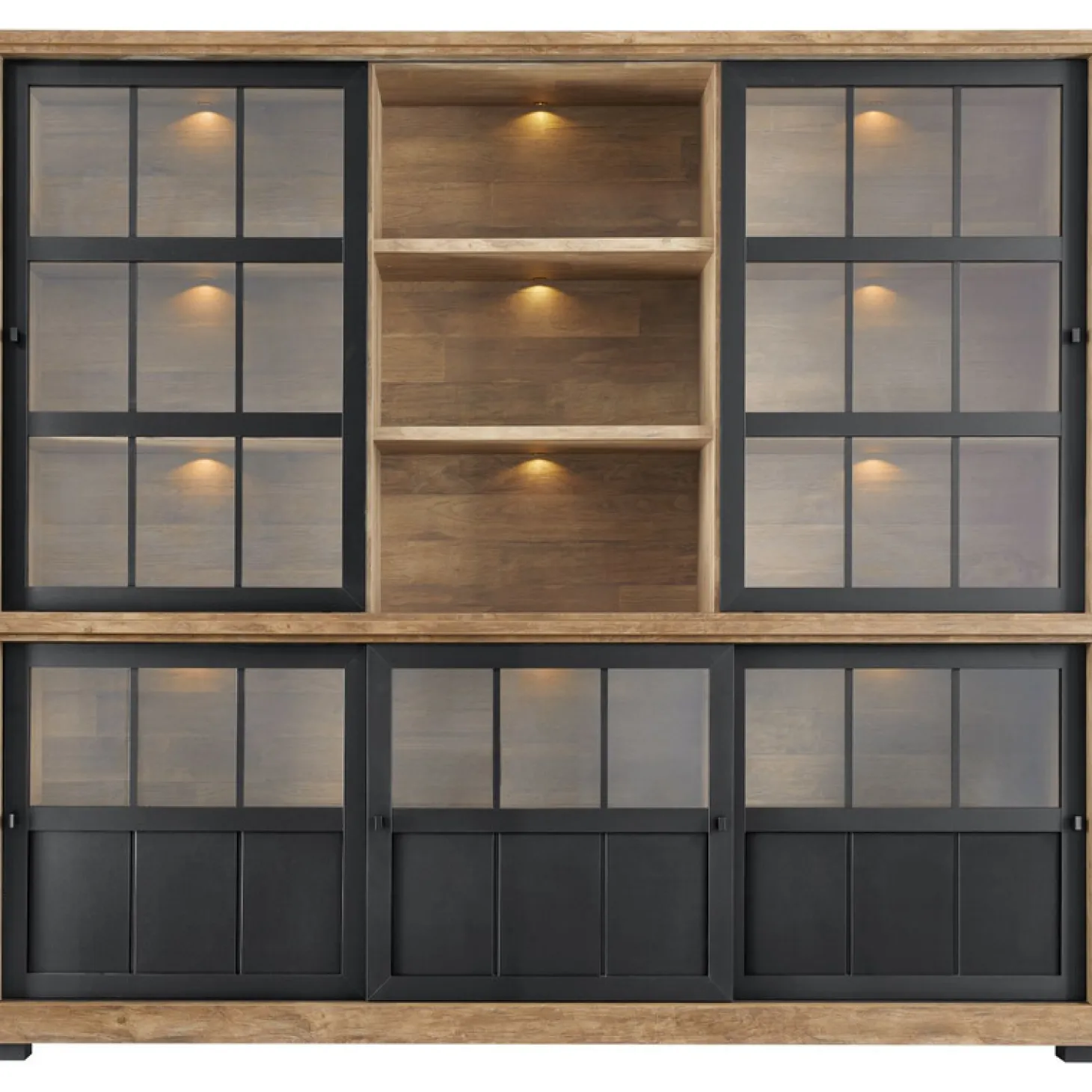 | Uitvoering | Uitgevoerd in de kleur old teak i.c.m. black met 2 glazen schuifdeuren, 3 kleine glazen schuifdeuren en 3 open vakken, incl. verlichting. |
