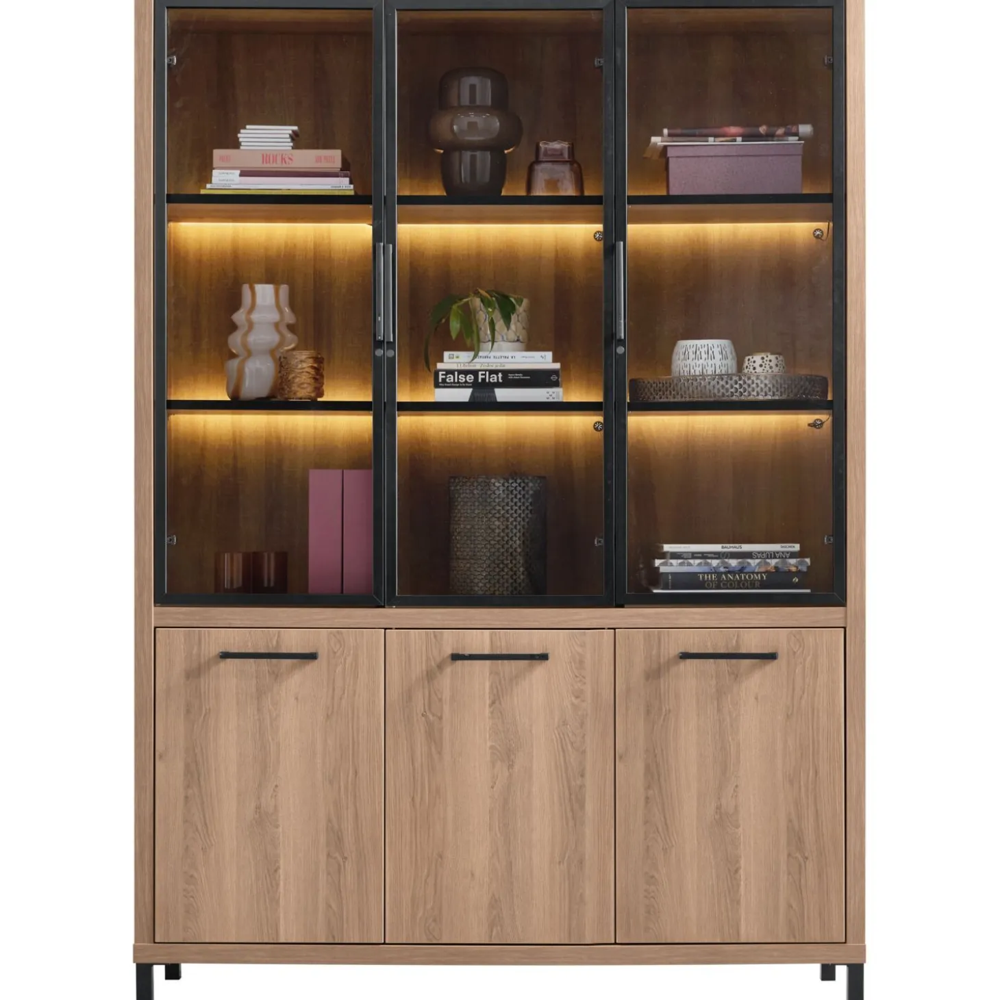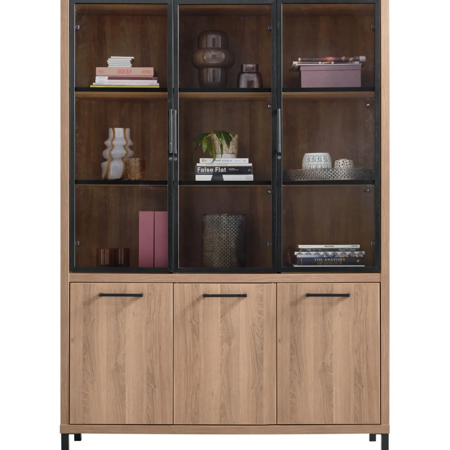 | Uitvoering | Uitgevoerd in melamine in de kleur brown cuneo oak met 3 deuren, 3 glasdeuren en zwart metalen poten. |