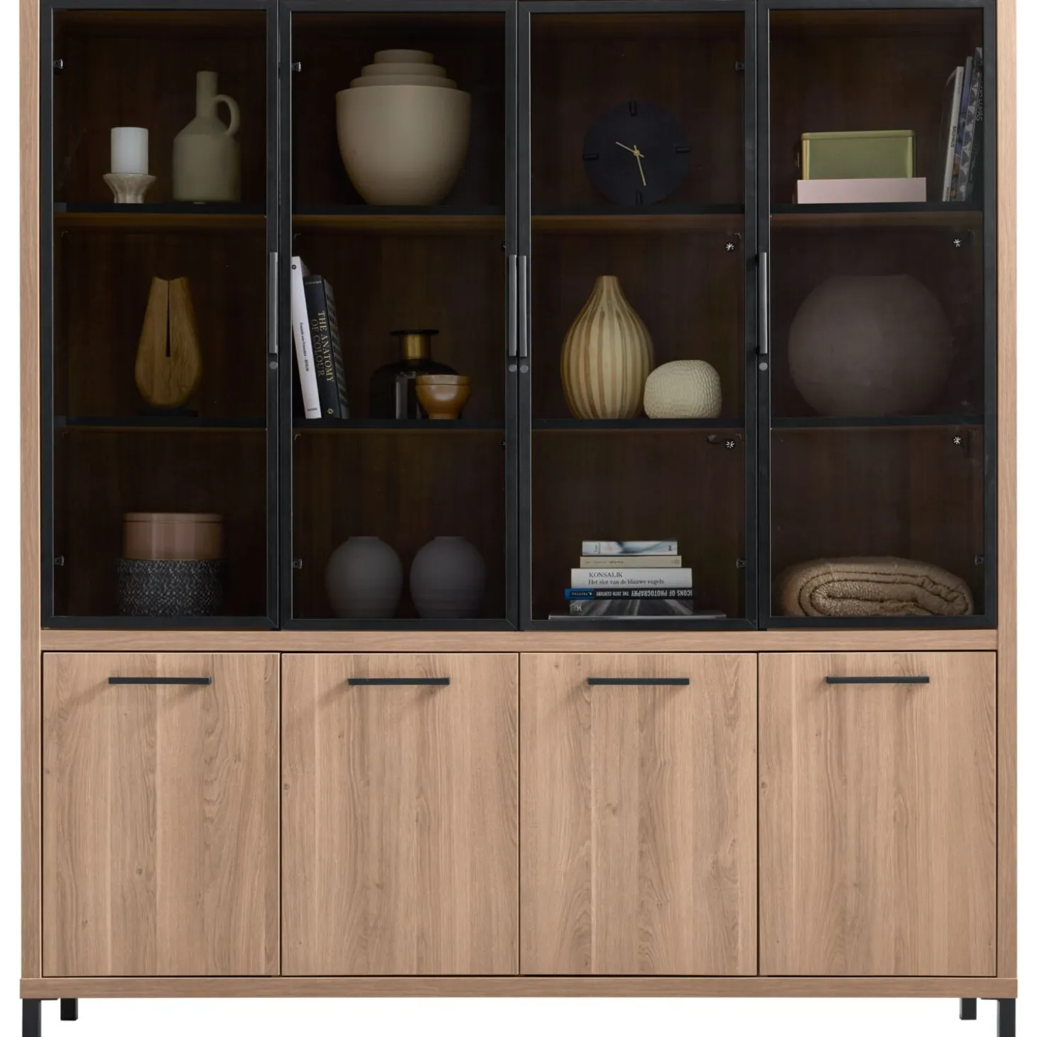 | Uitvoering | Uitgevoerd in melamine in de kleur brown cuneo oak met 4 deuren, 4 glasdeuren en zwart metalen poten. |