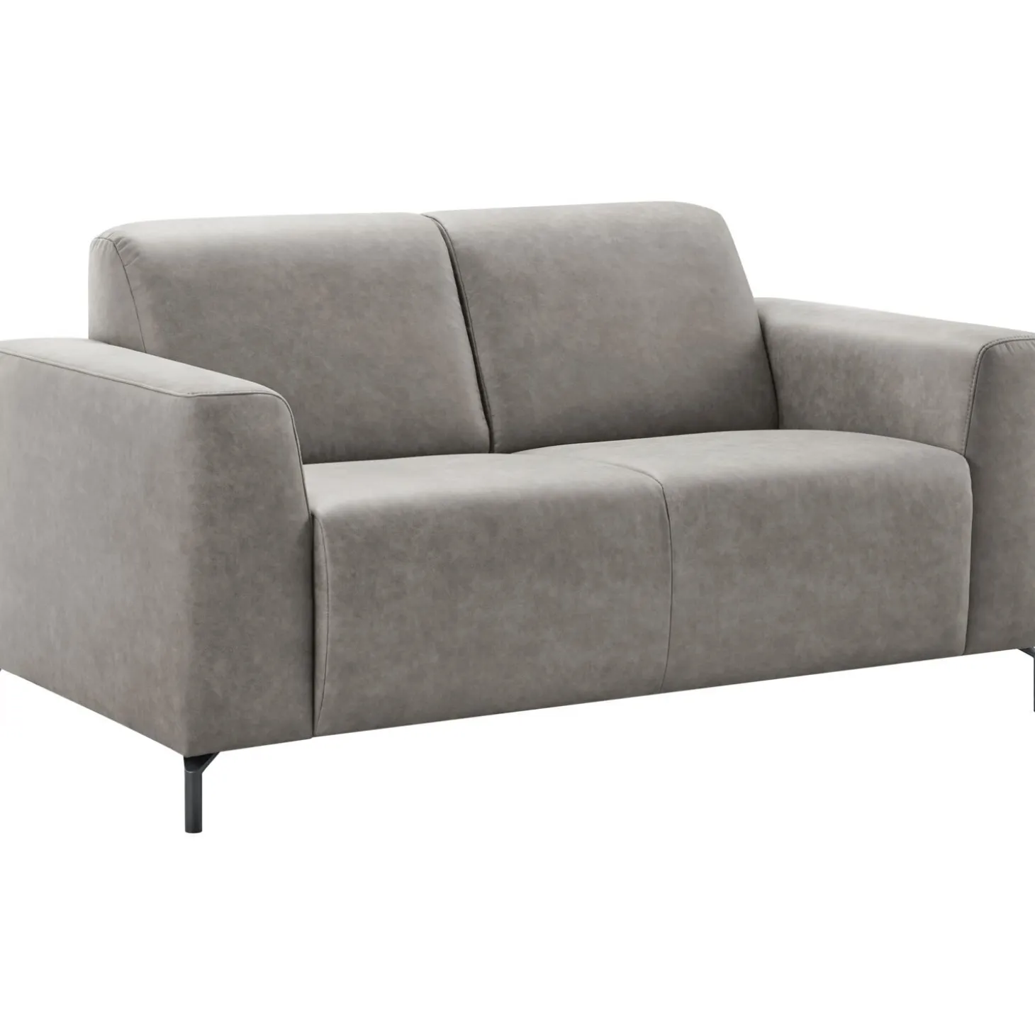 2 zitsbank Aveiro is bekleed met een grijze stof die het uiterlijk en gevoel heeft van echt leer. Deze sterke stof geeft de bank een natuurlijke uitstraling. Aveiro heeft aan de binnenkant afgeronde armleuningen voor een mooi speels effect. In de winkel is de bank verkrijgbaar met 3 verschillende armbreedtes om je gewenste leuning te creëren. De bank staat op zwart metalen poten voor een moderne uitstraling.