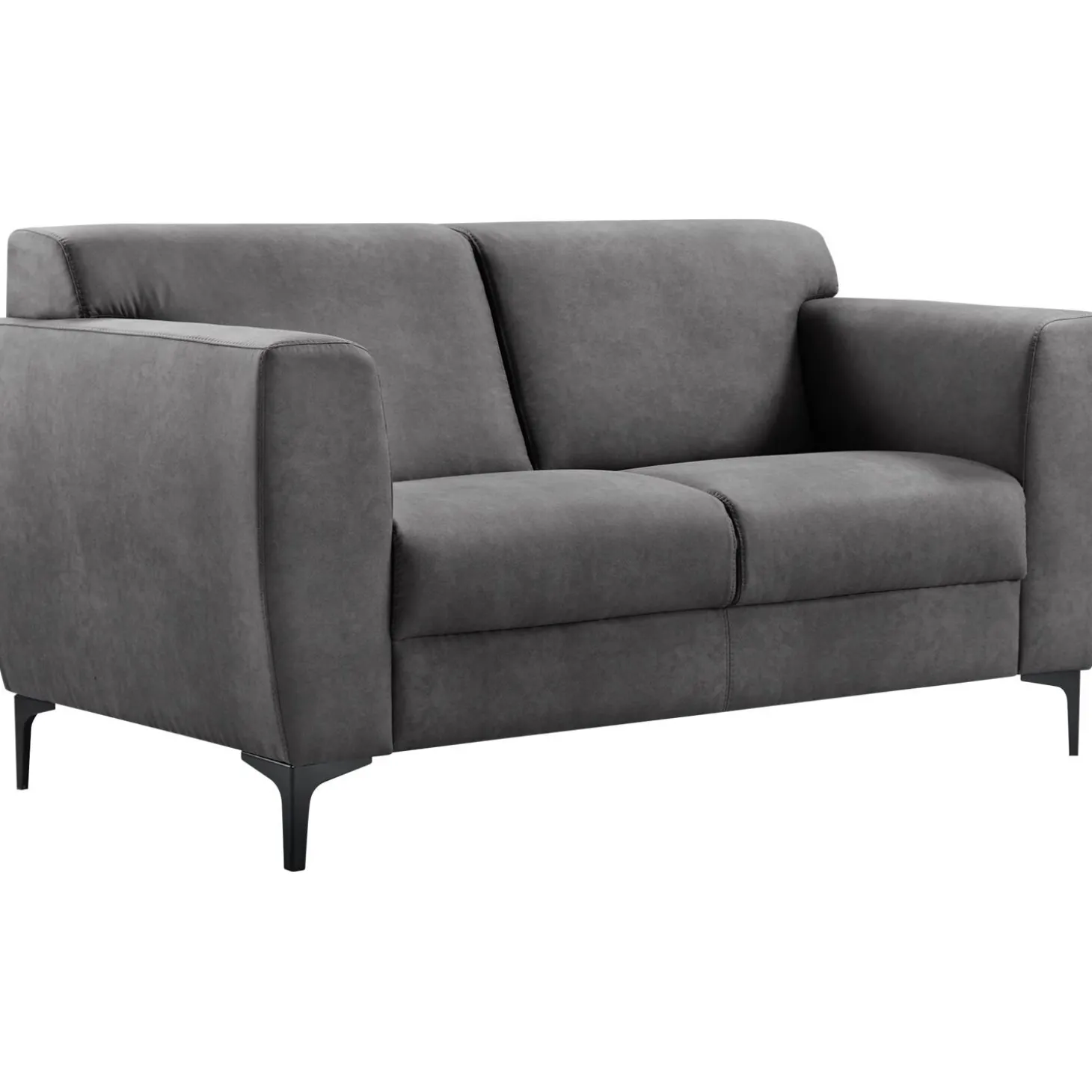 De bank is uitgevoerd in een donkergrijze microvezelstof. Deze stof met luxe uitstraling is opgebouwd uit synthetische vezels, waardoor deze erg sterk is. Desondanks voelt hij erg zacht aan. Bovendien is de stof makkelijk in onderhoud, en erg geschikt voor intensief gebruik. De zwarte metalen poten voegen een vleugje elegantie en duurzaamheid toe aan het geheel.