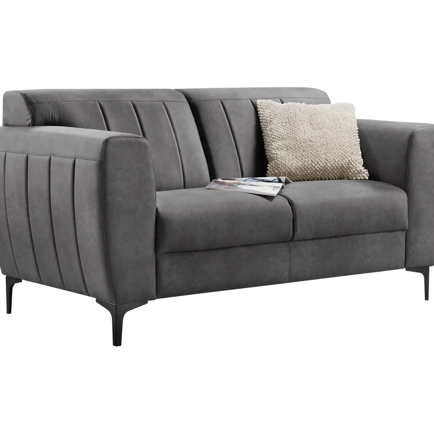 De bank is uitgevoerd in een donkergrijze microvezelstof. Deze stof met luxe uitstraling is opgebouwd uit synthetische vezels, waardoor deze erg sterk is. Desondanks voelt hij erg zacht aan. Bovendien is de stof makkelijk in onderhoud, en erg geschikt voor intensief gebruik. De zwarte metalen poten voegen een vleugje elegantie en duurzaamheid toe aan het geheel.