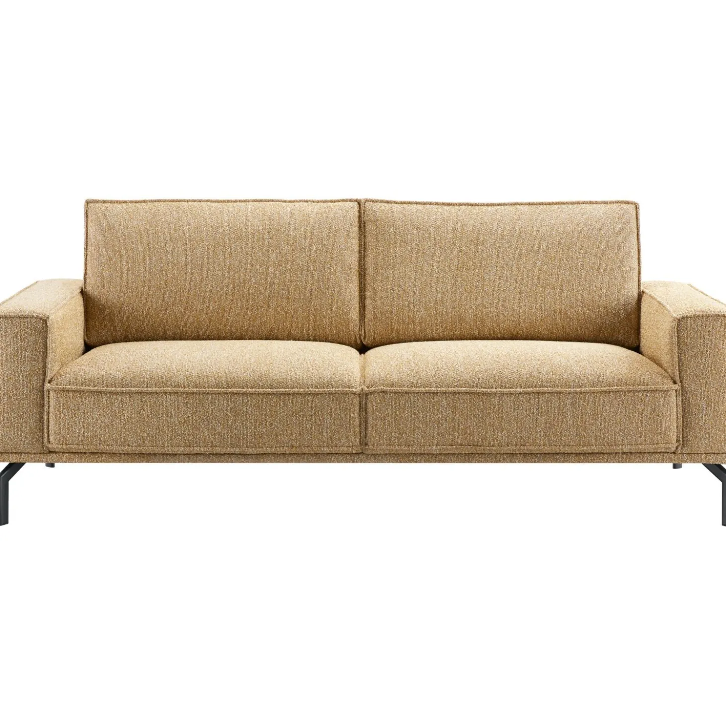 | Uitvoering | Uitgevoerd in stof flona 21-mustard met pocketvering met een toplaag van polyetherschuim in de zitting, HR-koudschuim in de rug en zwarte metalen poten, hoogte 19 cm. |