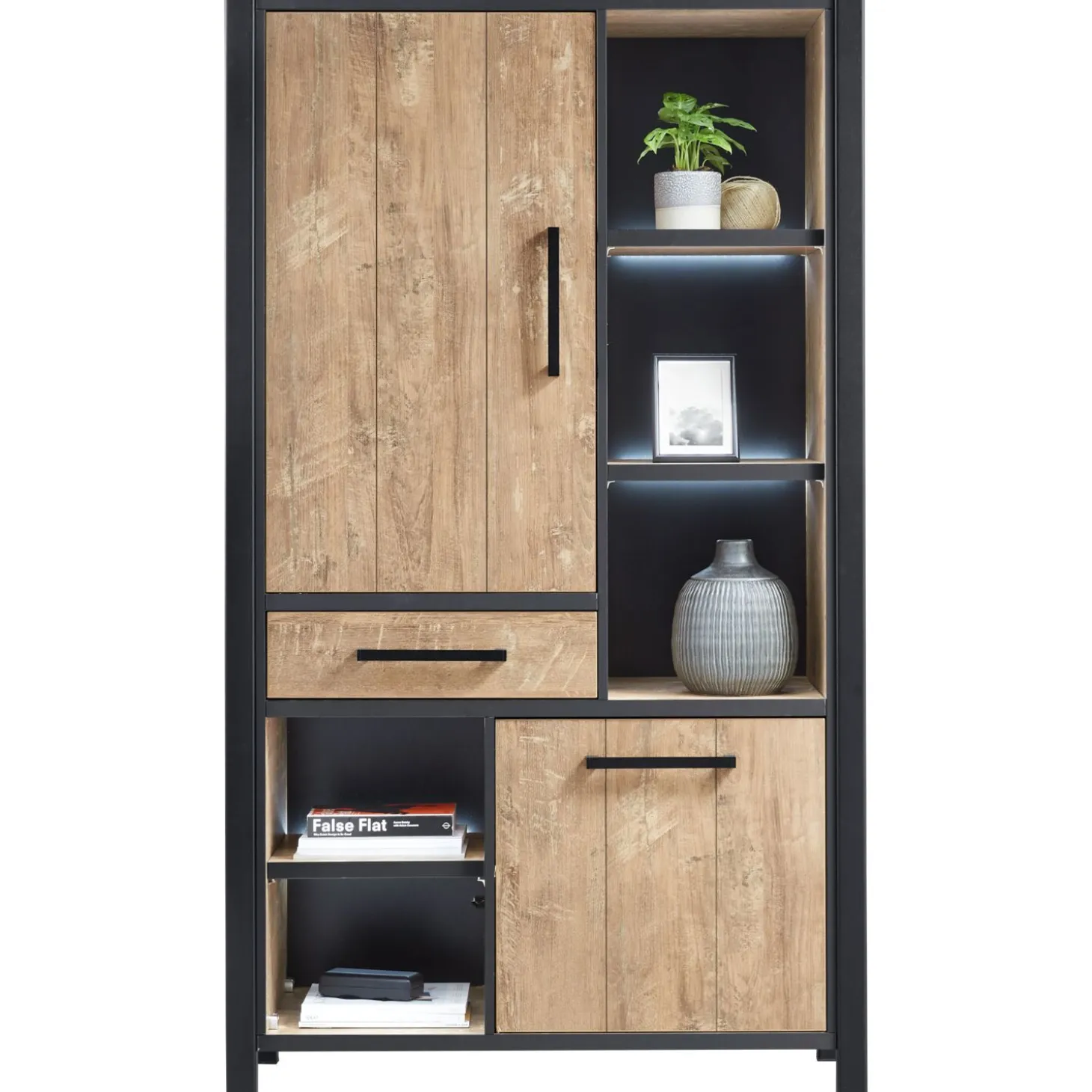 | Uitvoering | Uitgevoerd in de kleur orange teak wood i.c.m. mat zwart metaal met 2 deuren, 1 lade en 5 open vakken, incl. verlichting. |