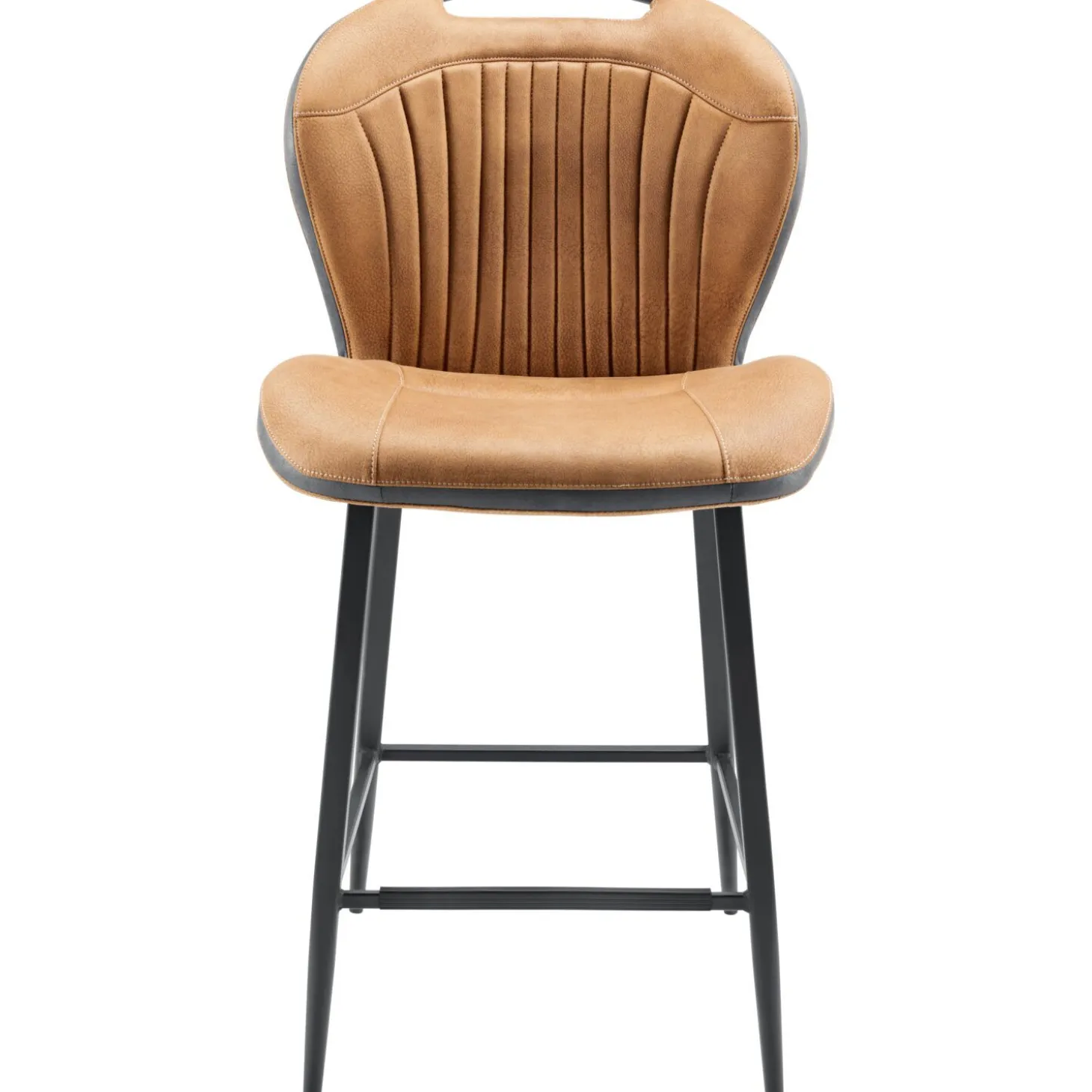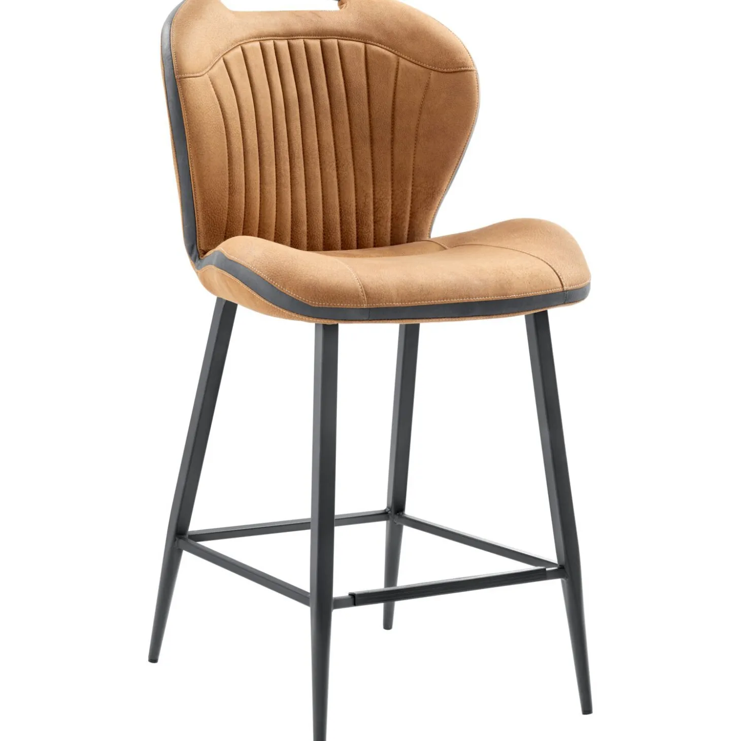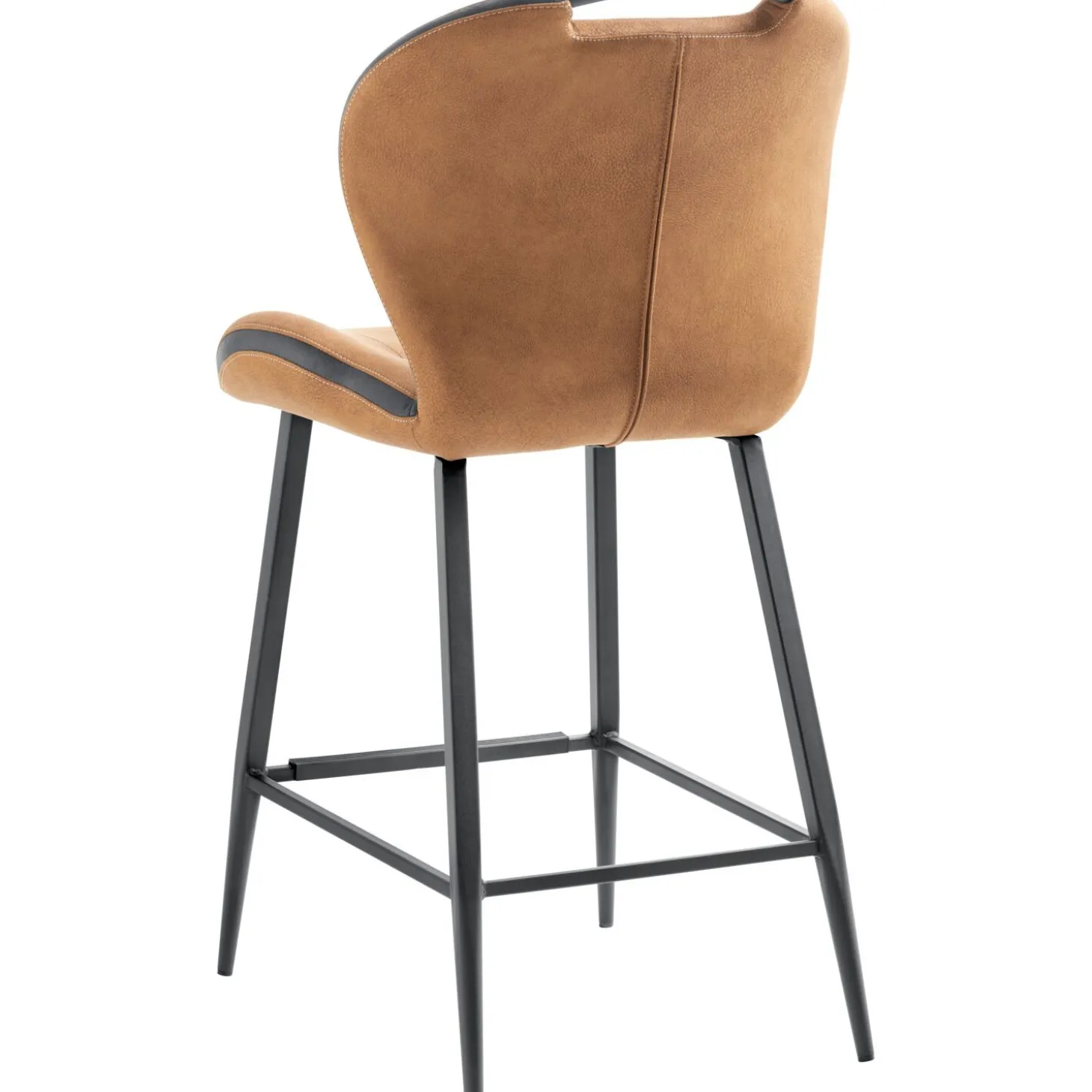 Deze cognackleurige barkruk Tubac combineert een stoer uiterlijk met een heerlijk comfort. De kruk is bekleed met een gladde stof die een zichtbare leernerf heeft en aangenaam zacht aanvoelt. Over de rand van de zitting en de rugleuning loopt een antracietkleurige band. Samen met de sierstiksels in de rugleuning, de zwart metalen hoekige poten en de geïntegreerde handgreep, geeft dit de barkruk een industriële uitstraling.