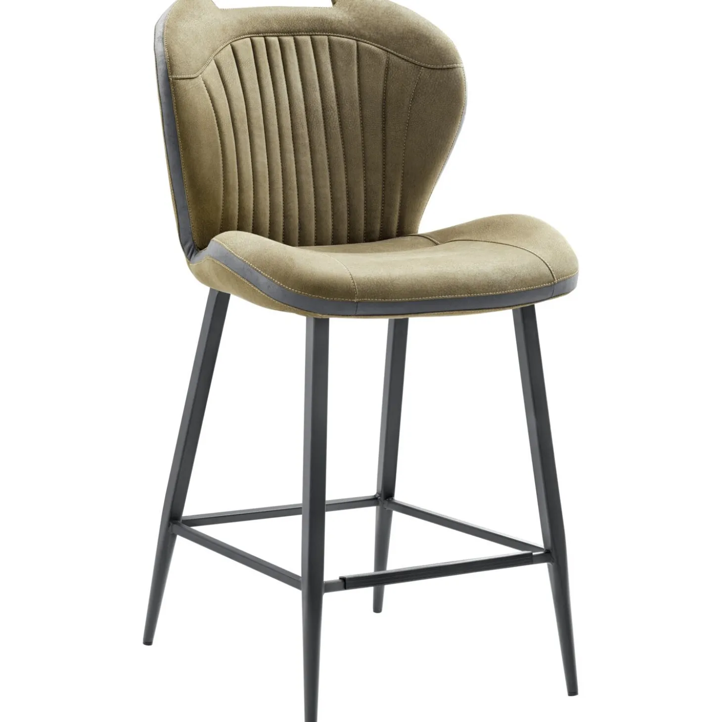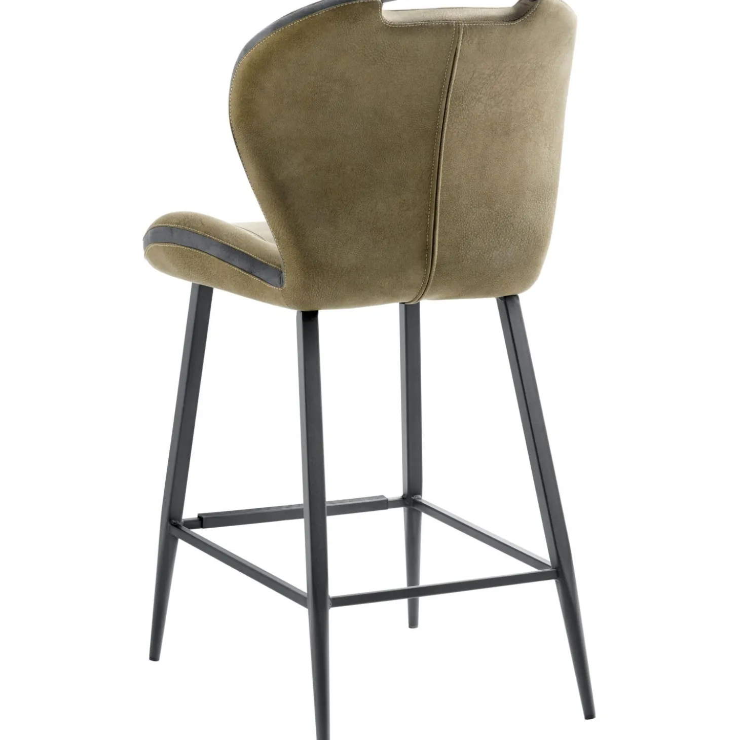 Deze mosgroene barkruk Tubac combineert een stoer uiterlijk met een heerlijk comfort. De kruk is bekleed met een gladde stof die een zichtbare leernerf heeft en aangenaam zacht aanvoelt. Over de rand van de zitting en de rugleuning loopt een antracietkleurige band. Samen met de sierstiksels in de rugleuning, de zwart metalen hoekige poten en de geïntegreerde handgreep, geeft dit de barkruk een industriële uitstraling.
