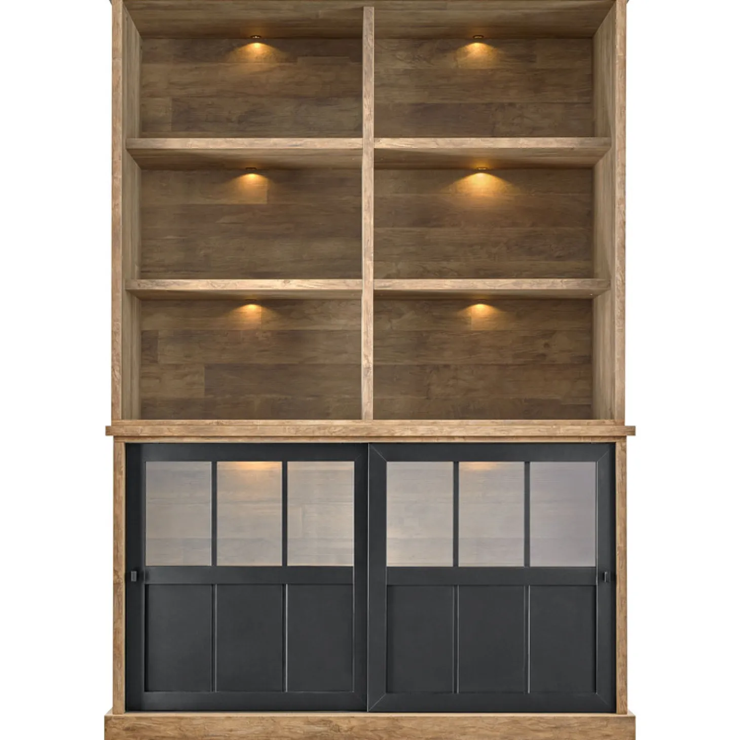 | Uitvoering | Uitgevoerd in de kleur old teak i.c.m. black met 2 glazen schuifdeuren en 6 open vakken, incl. verlichting. |