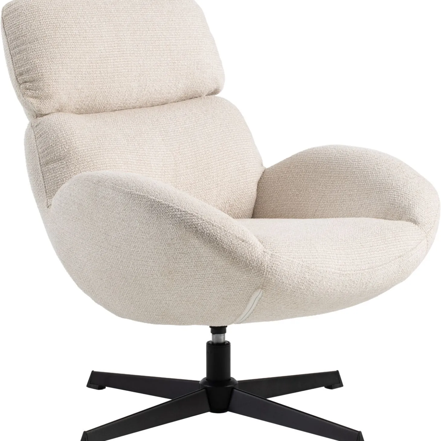 | Uitvoering | Uitgevoerd in stof milan 103-cream met polyetherschuim in de zitting en rug en een zwarte metalen draaipoot. |