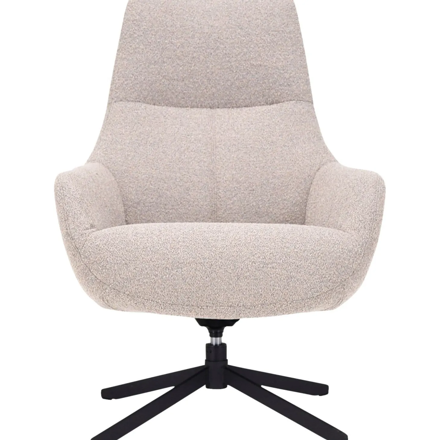 | Uitvoering | Uitgevoerd in stof alpine 01-natural met polyetherschuim in de zitting, polyetherschuim in de rug en een zwart metalen 4-teens draaipoot. |