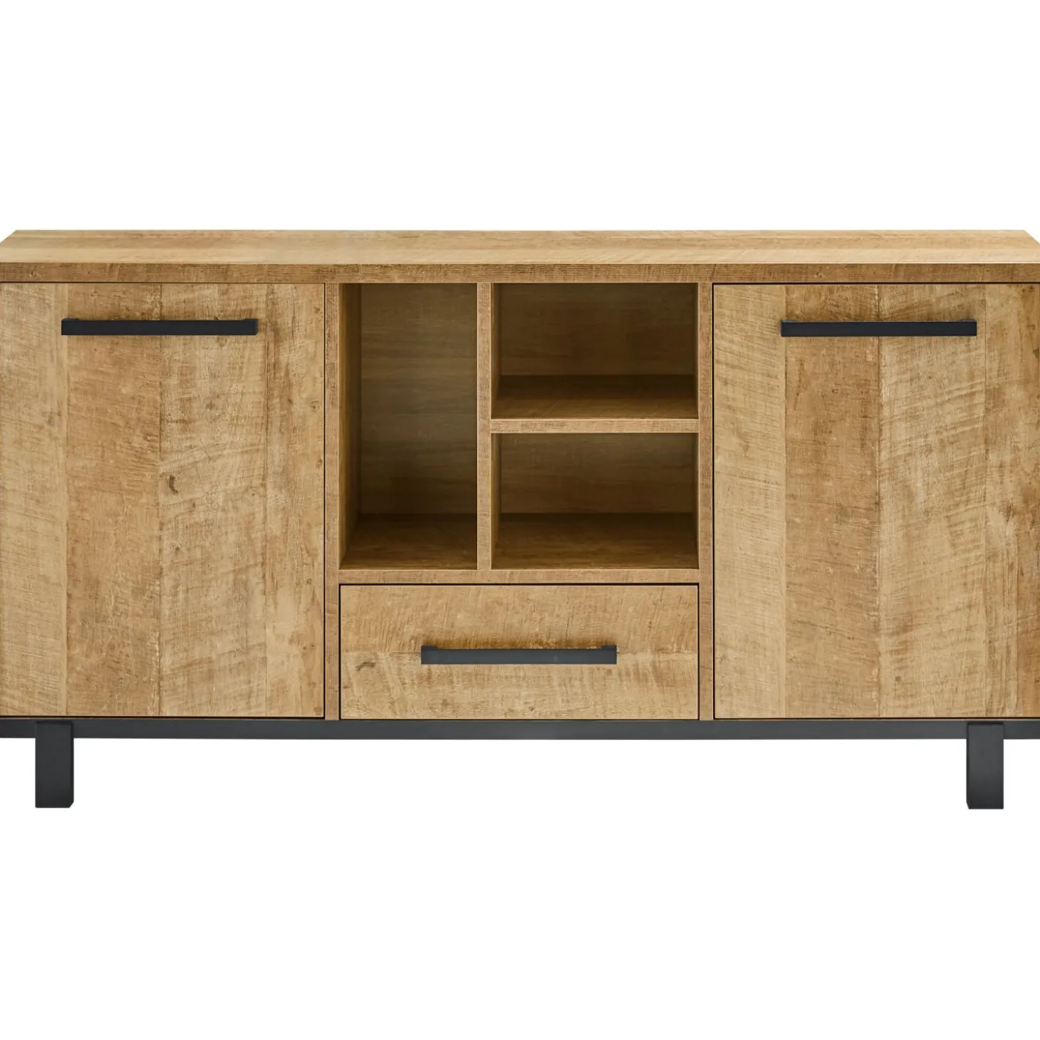| Uitvoering | Uitgevoerd in de kleur old teak met zwart metalen frame, 2 deuren, 1 lade en 3 open vakken. |