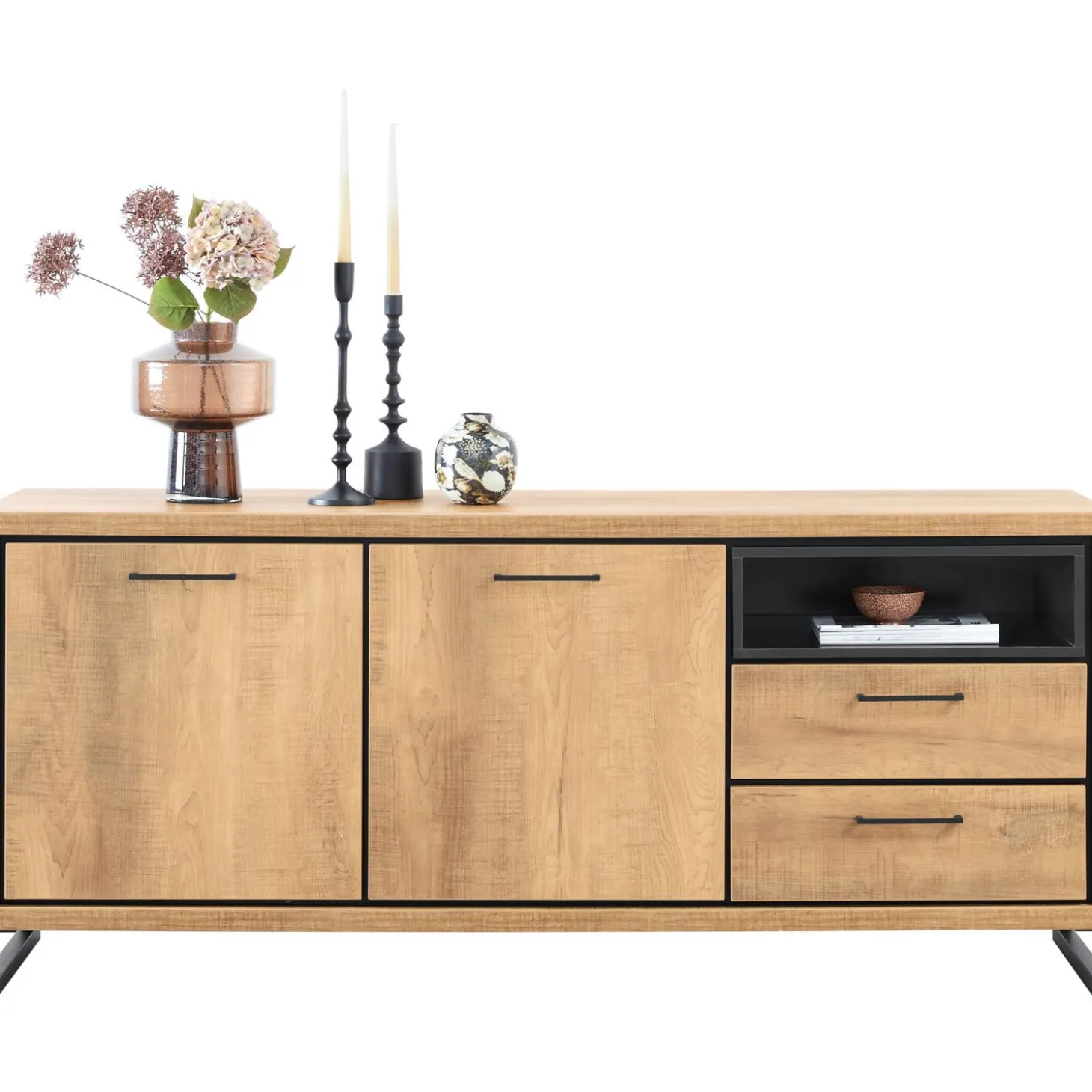 | Uitvoering | Uitgevoerd in melamine mango decor met zwart metalen frame met 2 deuren, 3 laden en 1 open vak. |