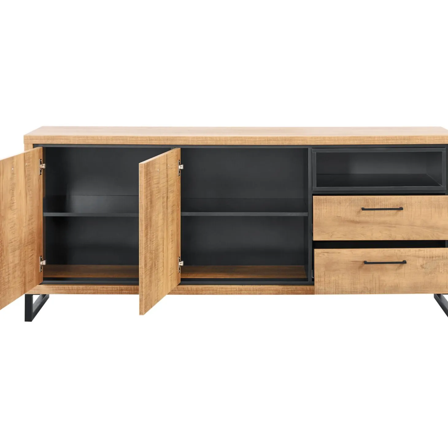 - Met 2 deuren, 2 lades, en 1 open vak