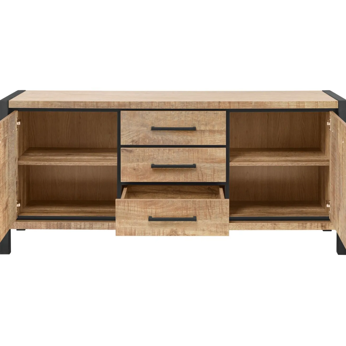 | Uitvoering | Uitgevoerd in de kleur mango met zwart metalen frame, 2 deuren en 3 laden. |