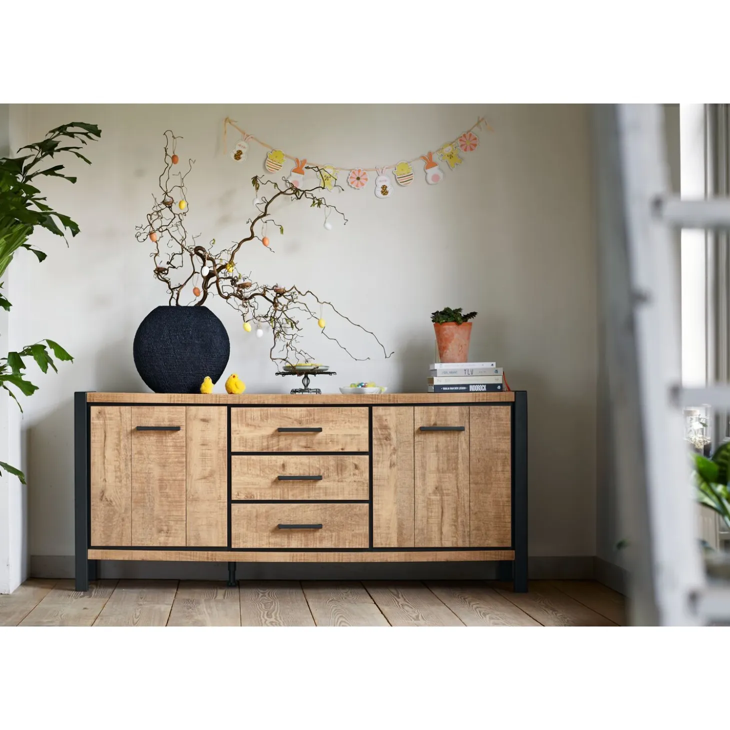 Dit dressoir heeft een mooie uitstraling door de combinatie van zwart metaal met melamine in de kleur mango. Melamine lijkt op echt hout, het is makkelijk in onderhoud en erg krasbestendig. Een erg gebruiksvriendelijke dressoir dus!