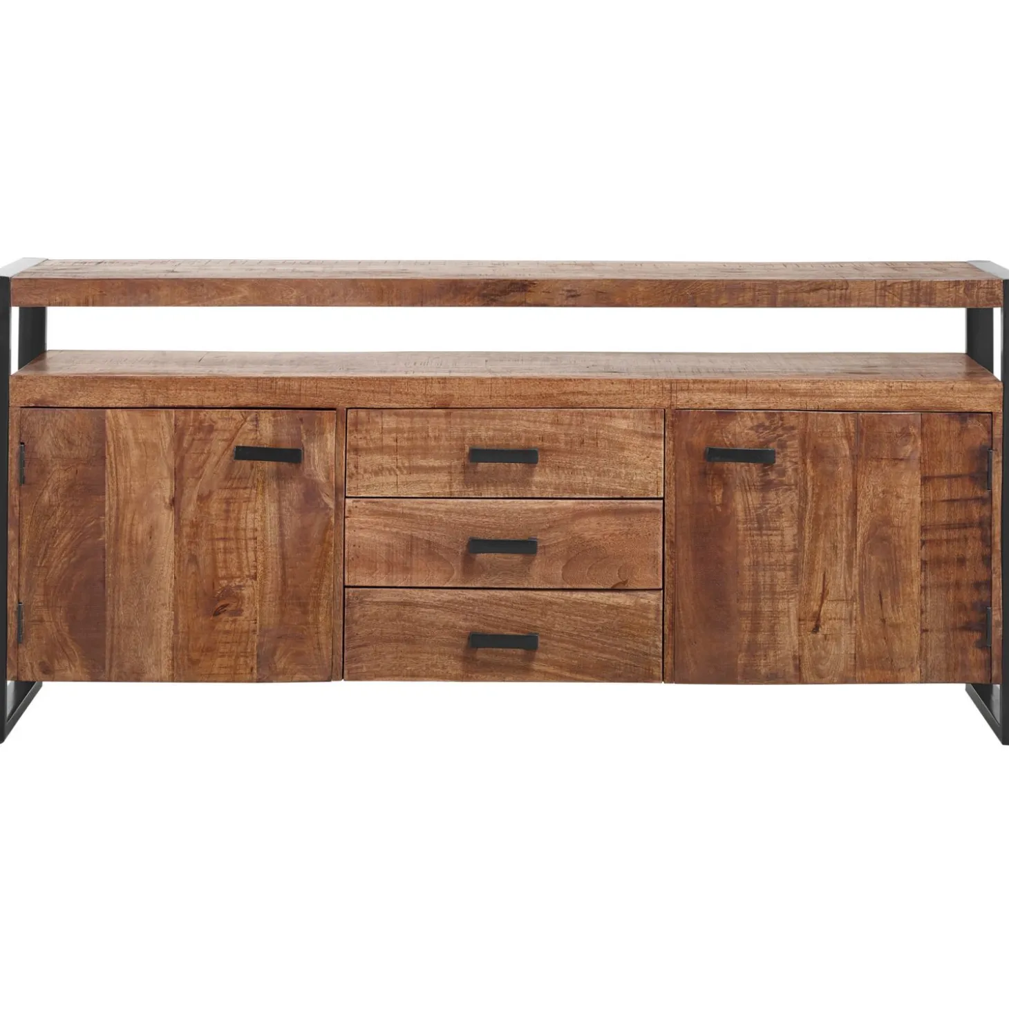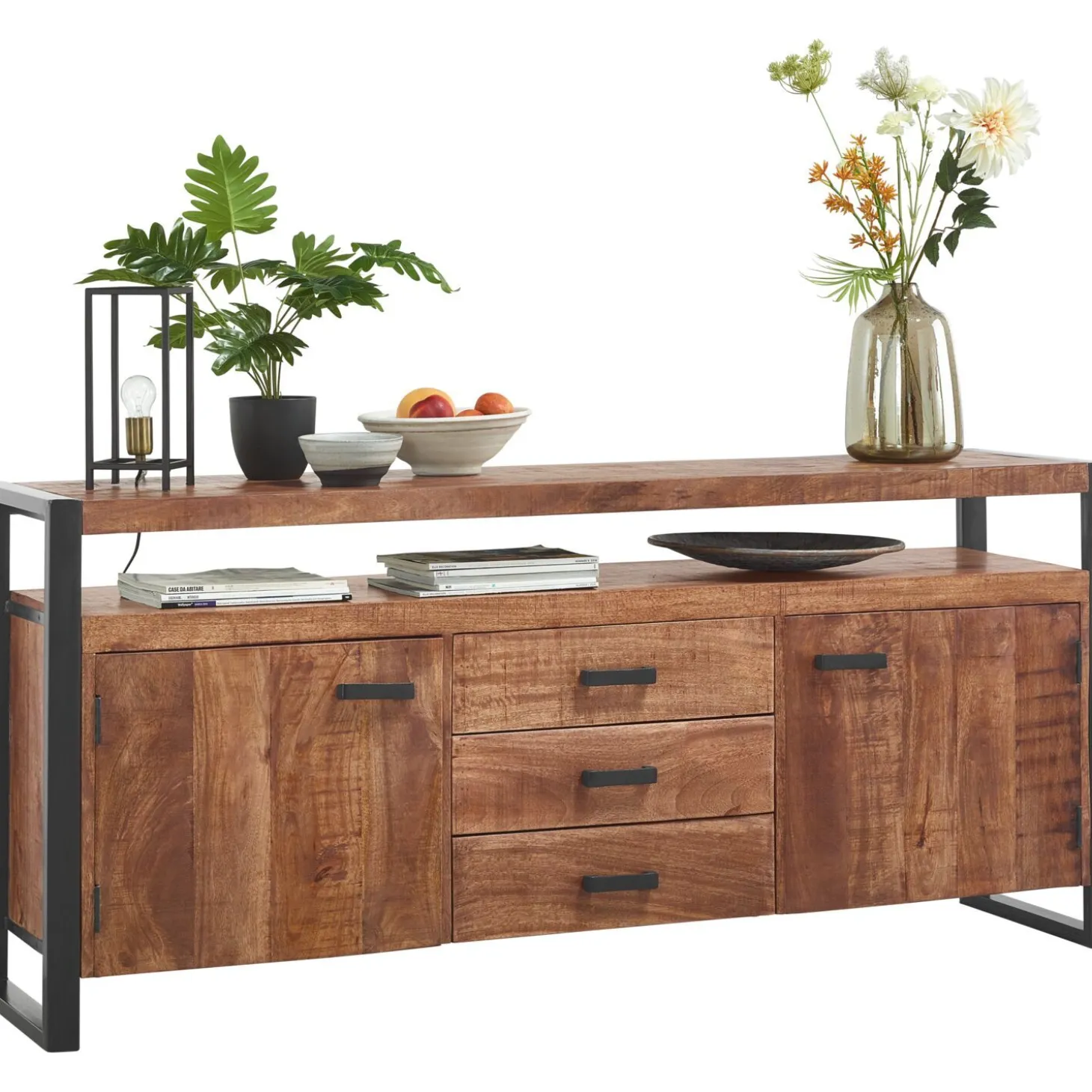 | Uitvoering | Uitgevoerd in mangohout in de kleur new weather barn met zwart metalen frame met 2 deuren en 3 laden. |