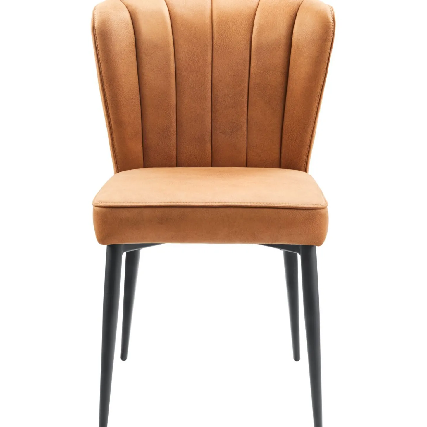 Met stoel Colby haal je een stijlvolle stoel met een heerlijk stevige zit in huis! De stoel is bekleed met een gladde, luxe stof in de kleur cognac. De stof heeft een zichtbare leernerf en voelt heerlijk zacht aan. De verticale sierstiksels in de rugleuning zorgen voor een speels effect, terwijl de bies de lijnen van dit model extra benadrukt. De ronde zwart metalen poten zorgen voor een modern accent, wat maakt dat deze stoel in praktisch ieder interieur goed te combineren is.