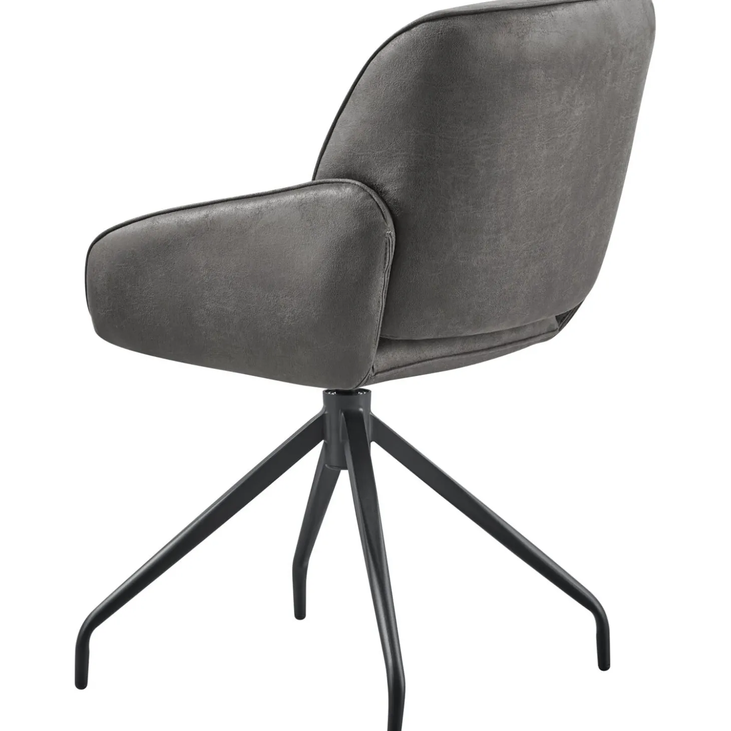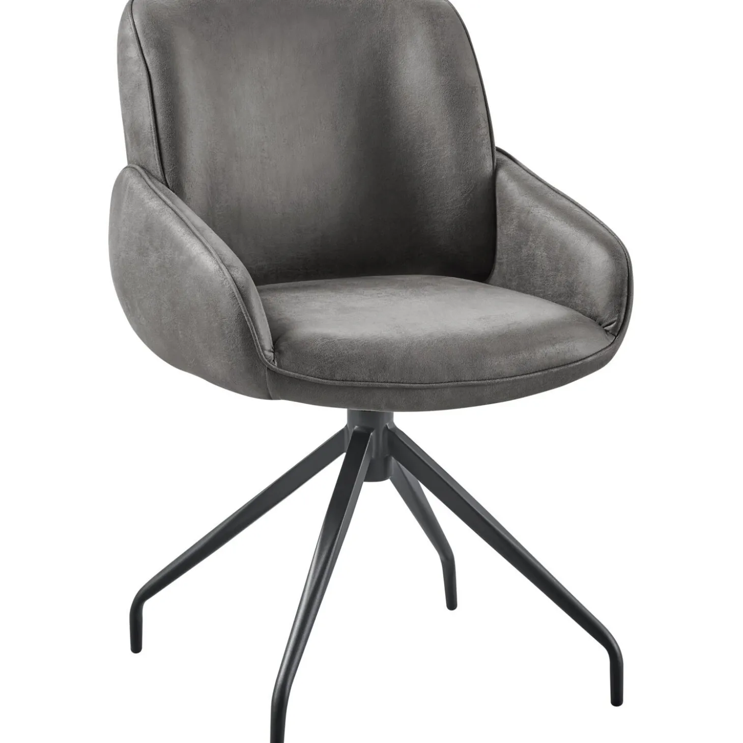 De Lusby armstoel is een heerlijk comfortabele stoel met een stevig zitcomfort, armleuningen en zwart metalen draaipoot. De stoel is bekleed met stof Chicago in de kleur donkergrijs. De stof heeft een zichtbare leernerf en voelt zacht aan. De armhoogte van de stoel is 64cm, goed om rekening mee te houden wanneer je ze onder een eettafel wilt plaatsen.