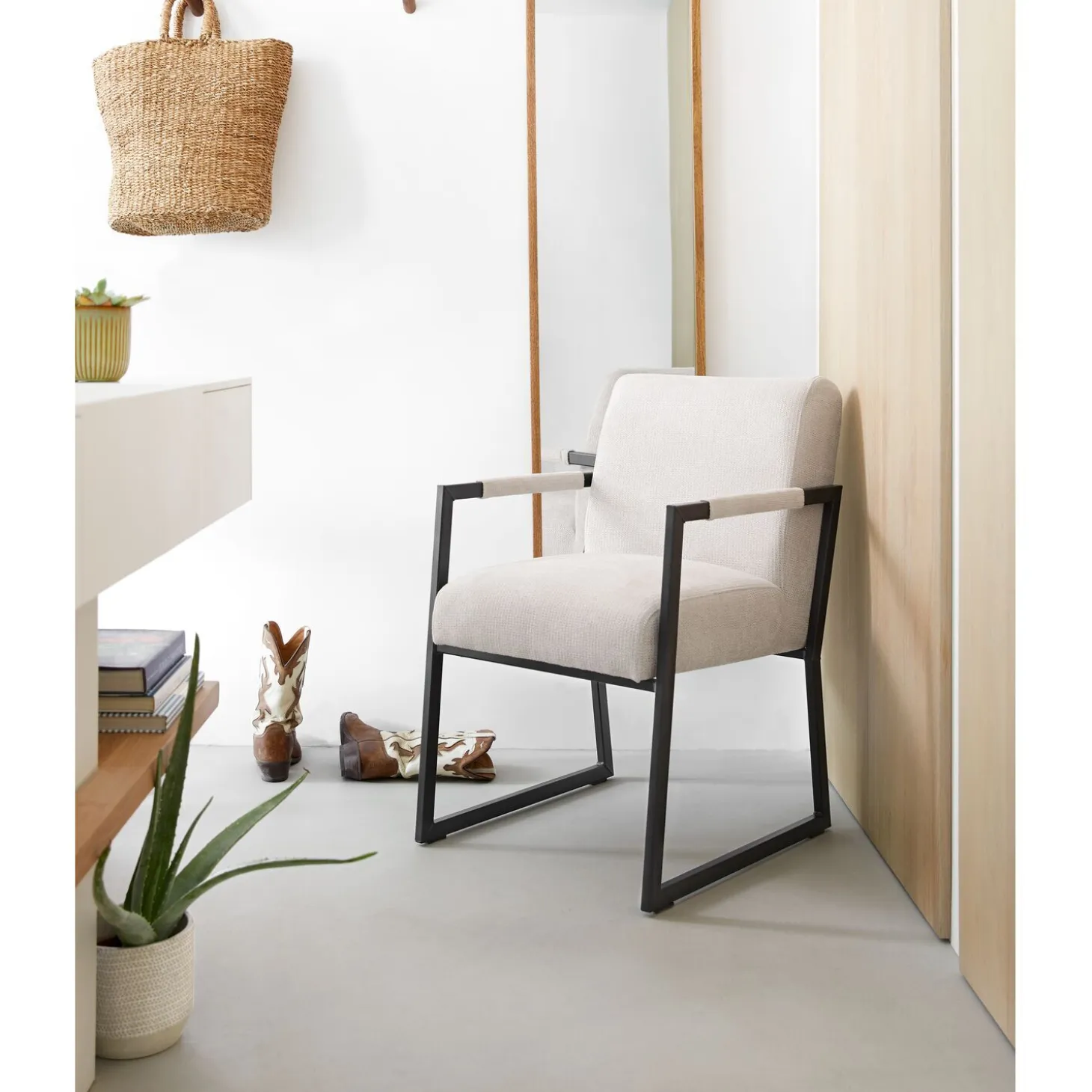 Armstoel Thurso is een heerlijk comfortabele stoel. Deze versie van Thurso is uitgevoerd in de crèmekleurige stof Mito, een gemêleerde weefstof. De licht meerkleurige kwaliteit heeft een wat grovere structuur, maar wel een erg zachte touch. De industriële armleuningen zijn voor een gedeelte bekleed met deze stof voor extra comfort. Met de handige handgreep in de rugleuning is Thurso gemakkelijk te verplaatsen. De zitting is comfortabel dik en voorzien van nosagvering, wat een licht verend zitcomfort geeft en lang zijn vorm behoud. Stoel Thurso is zeer geschikt voor uren natafelen. De stoel is te belasten tot 120 kg.