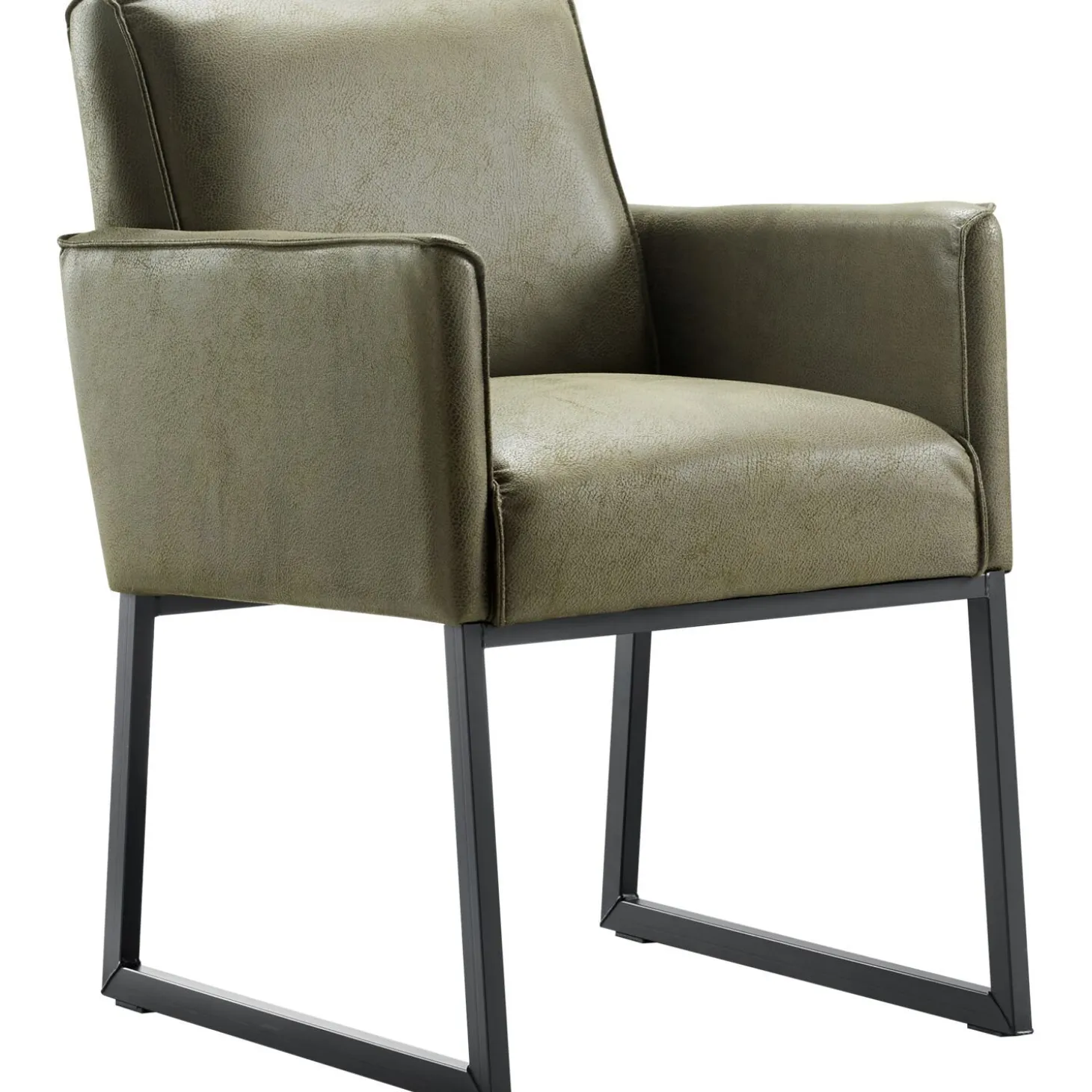 De fraaie vlindernaad in combinatie met microleder dakota in de kleur turtle is wat deze uitvoering van stoel Thurso een comfortabele uitstraling geeft. Microleder dakota is een samengestelde bekleding van leder en stof met een mooie en luxe uitstraling en makkelijk in onderhoud. Het zwart metalen frame geeft de stoel een modern uiterlijk. De zitting is comfortabel dik en voorzien van nosagvering, wat een licht verend zitcomfort geeft en lang zijn vorm behoud. Deze luxe armstoel Thurso is zeer geschikt voor uren natafelen.