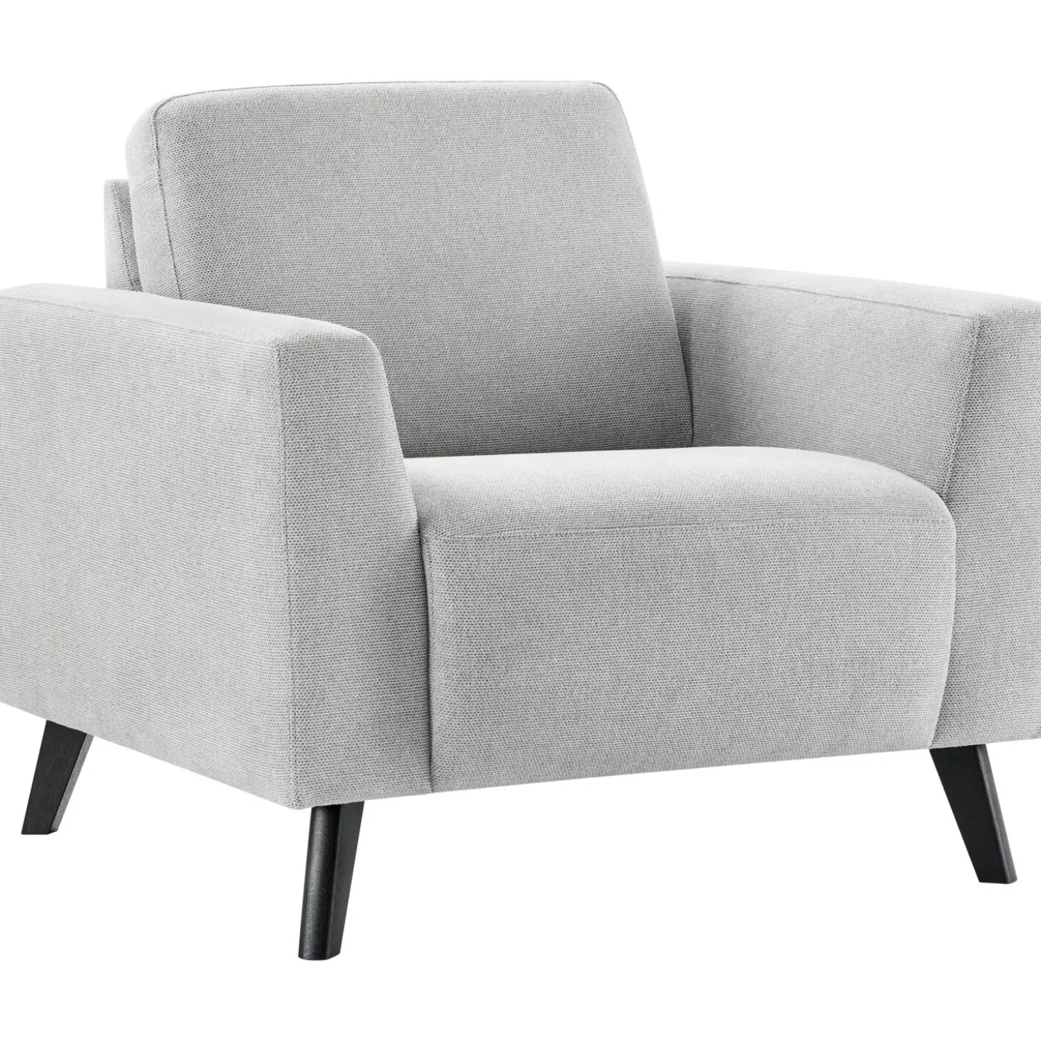 Fauteuil Nyborg heeft door de strakke vormen en zwarte houten poten een stoere, moderne uitstraling die in bijna interieur past. De fauteuil is uitgevoerd in een lichtgrijze wat grovere weefstof. Door het gebruik van diverse kleurnuances in grijstinten ontstaat een gemeleerde structuur. De stof voelt erg zacht aan.