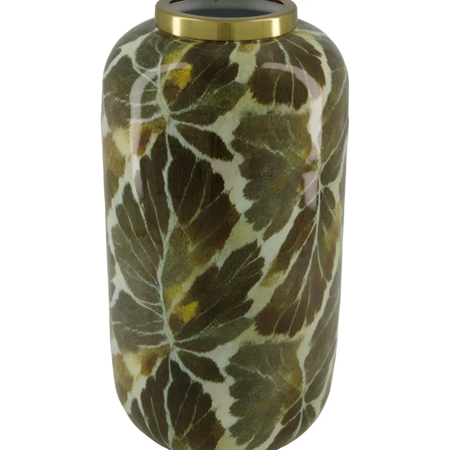 Deze elegante decoratieve fles is versierd met een subtiele groene bladerprint en brengt een frisse, natuurlijke sfeer in elk interieur. De slanke vorm maakt de fles een stijlvolle blikvanger, zowel losstaand als in combinatie met andere woonaccessoires. Perfect voor op een dressoir, tafel of vensterbank.