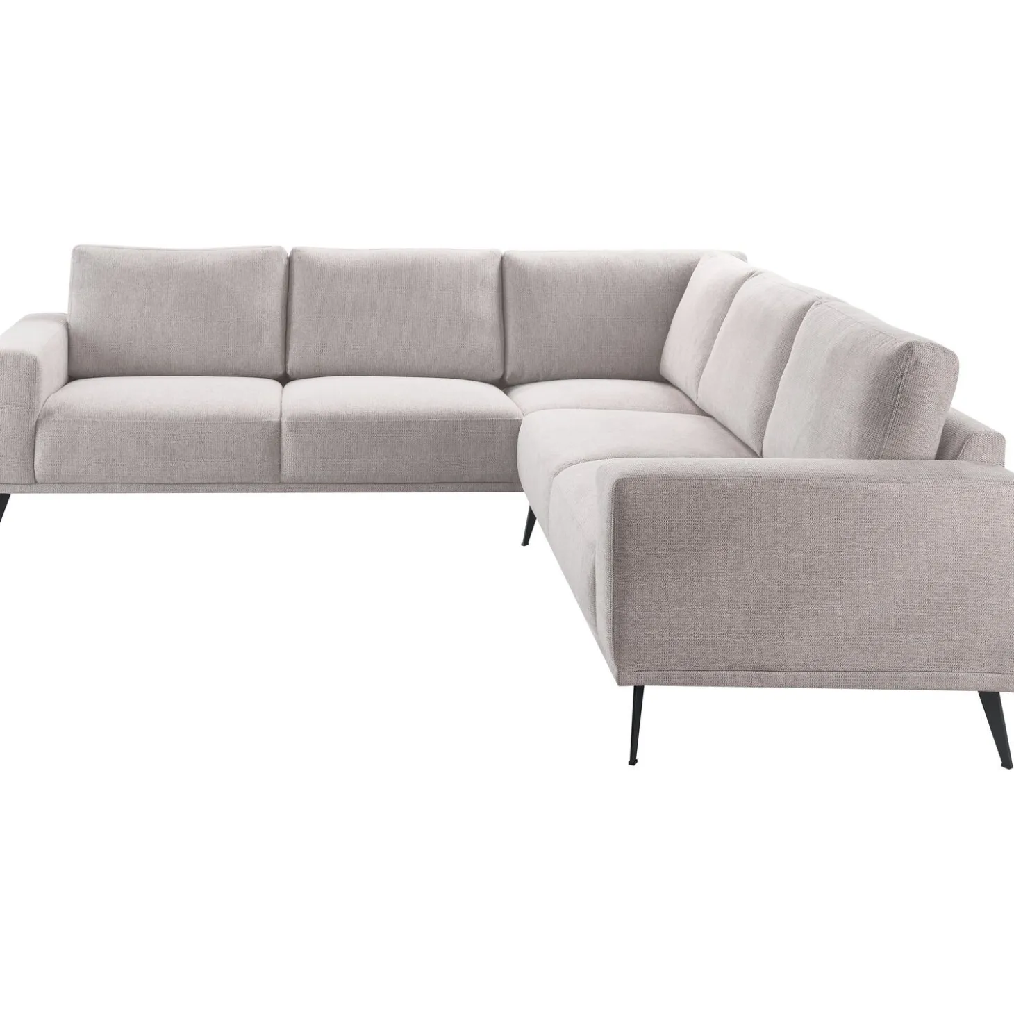 Hoekbank Lindon heeft door de strakke, kubistische vormen en zwart metalen poten een stoere, moderne uitstraling die eigenlijk in ieder interieur wel past. De bank is uitgevoerd in de lichtgrijze stof Mito. Deze licht meerkleurige kwaliteit heeft een wat grovere structuur, maar wel een erg zachte touch.
