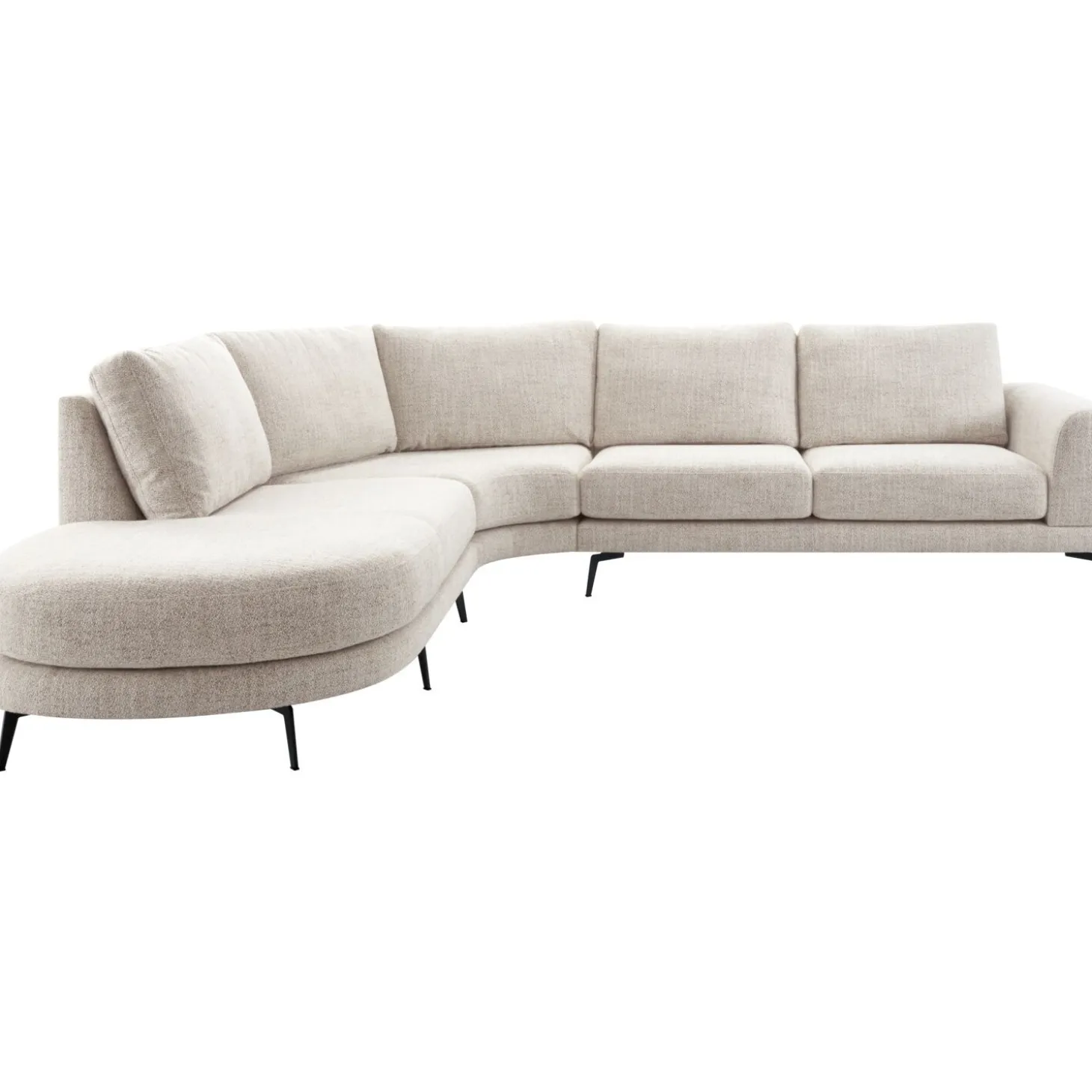 | Uitvoering | 1 zits met eiland rond links + hoekelement rond + 2,5 zits arm rechts uitgevoerd in stof oasis 91-bisque met polyetherschuim met een toplaag van HR-koudschuim in de zitting, mix van polyetherschuim- en siliconenvlokken in de rug en zwarte metalen poten, type M-15 (15 cm). |