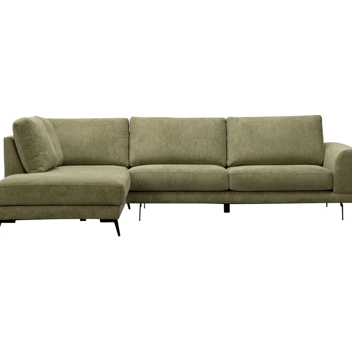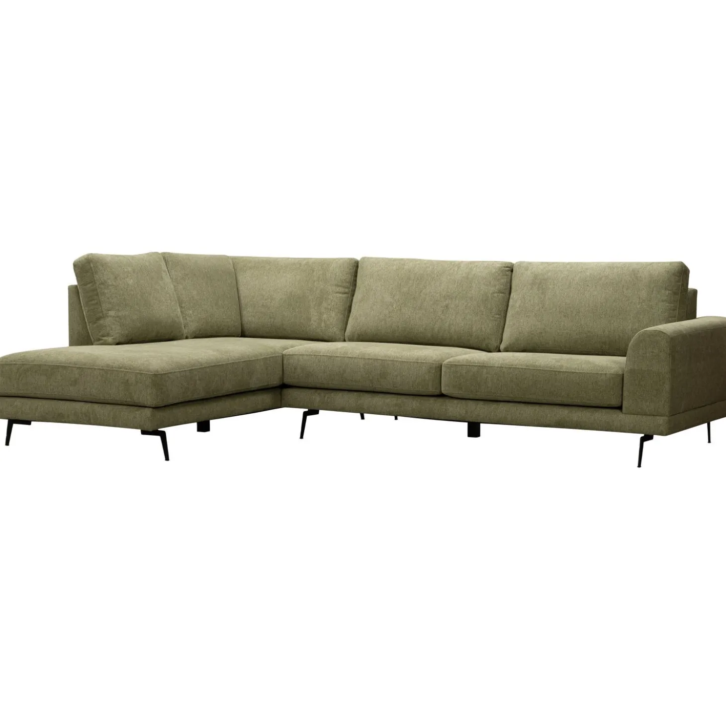 | Uitvoering | Hoek met eiland links + 3 zits arm rechts, uitgevoerd in stof mito 55-green met cpolyetherschuim met een toplaag van HR-koudschuim in de zitting, mix van polyetherschuim- en siliconenvlokken in de rug en zwarte metalen poten, type M-15 (15 cm). |