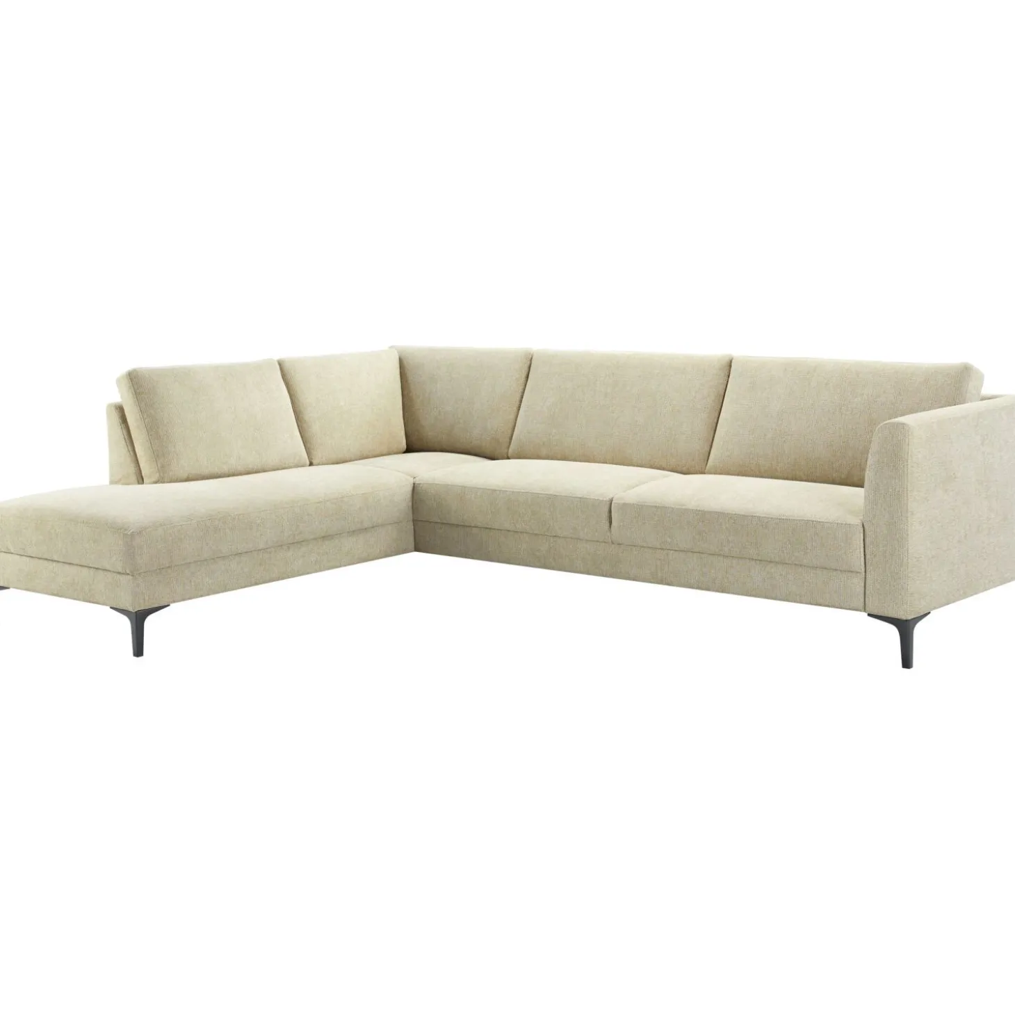 Hoekbank Gulnare is een ranke, strak vormgegeven hoekbank die zich in vrijwel ieder interieur thuis voelt. De bank is uitgevoerd in een gemêleerde weefstof met verschillende beige tinten, vleugje groen en een subtiele glans. Deze licht meerkleurige kwaliteit heeft een wat grovere structuur, maar wel een erg zachte touch. De zwart metalen poten zijn 15 cm hoog en maken de bank helemaal af.