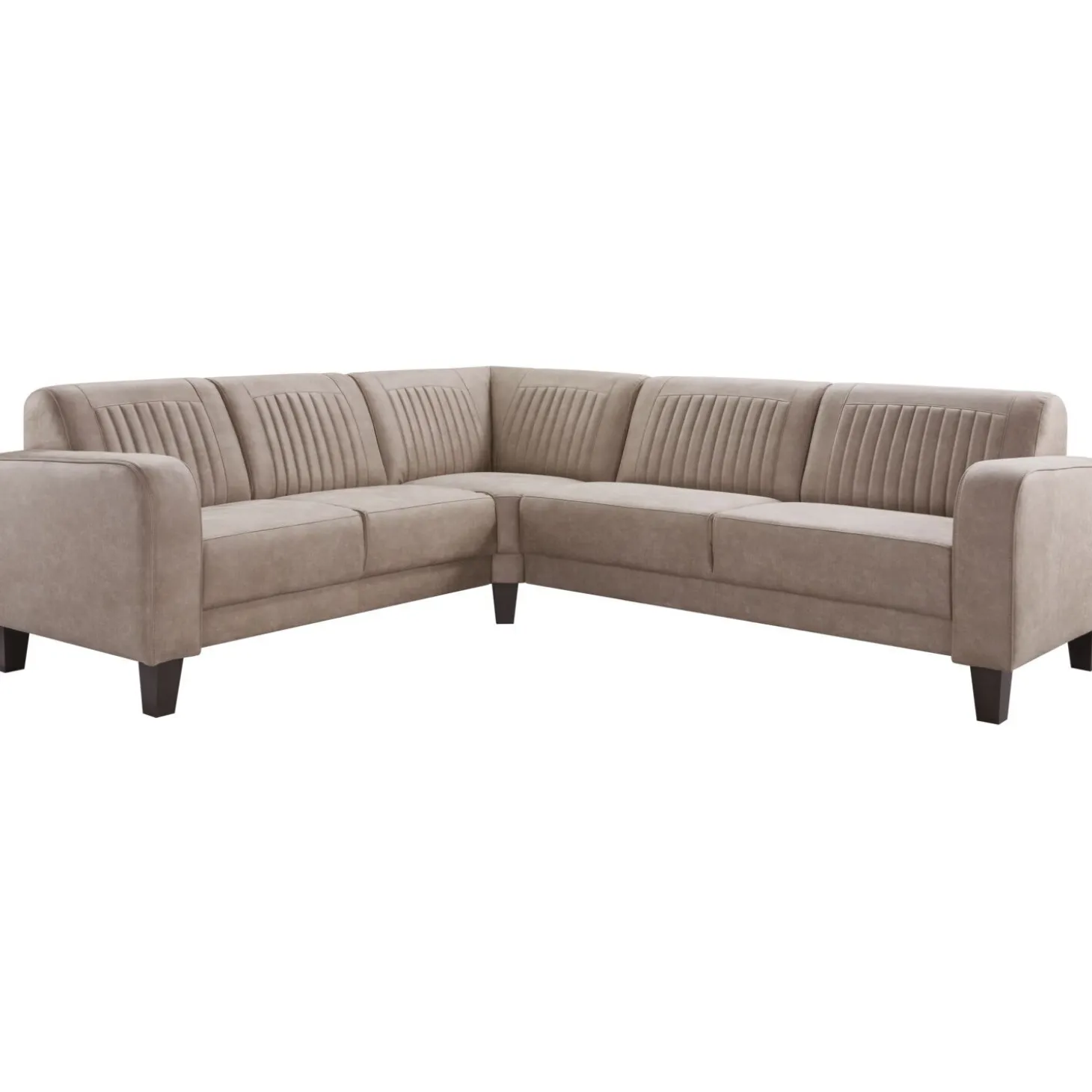 | Uitvoering | 2 zits arm links + grote hoek + 2,5 zits arm rechts, uitgevoerd in microleder bull 84-clay met bies in microleder bull 84-clay, polyetherschuim in de zitting, polyetherschuim in de rug en koloniaal houten poot type UNS (15 cm). |
