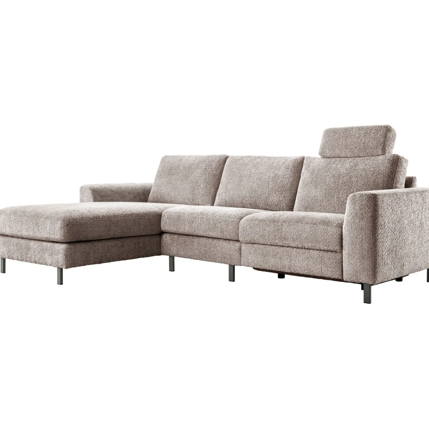 | Uitvoering | Longchair groot arm A links + 1 zits (80) zonder armen + 1 zits (80) arm A rechts met elektrische relaxfunctie en hoofdsteun 60 (met beugel in de kleur perle brown), uitgevoerd in stof venga 12-taupe met polyetherschuim in de zitting, een mix van polyetherschuim- en siliconenvlokken in de rug en metalen poten type MF5 in de kleur perle brown (hoogte 12 cm). |