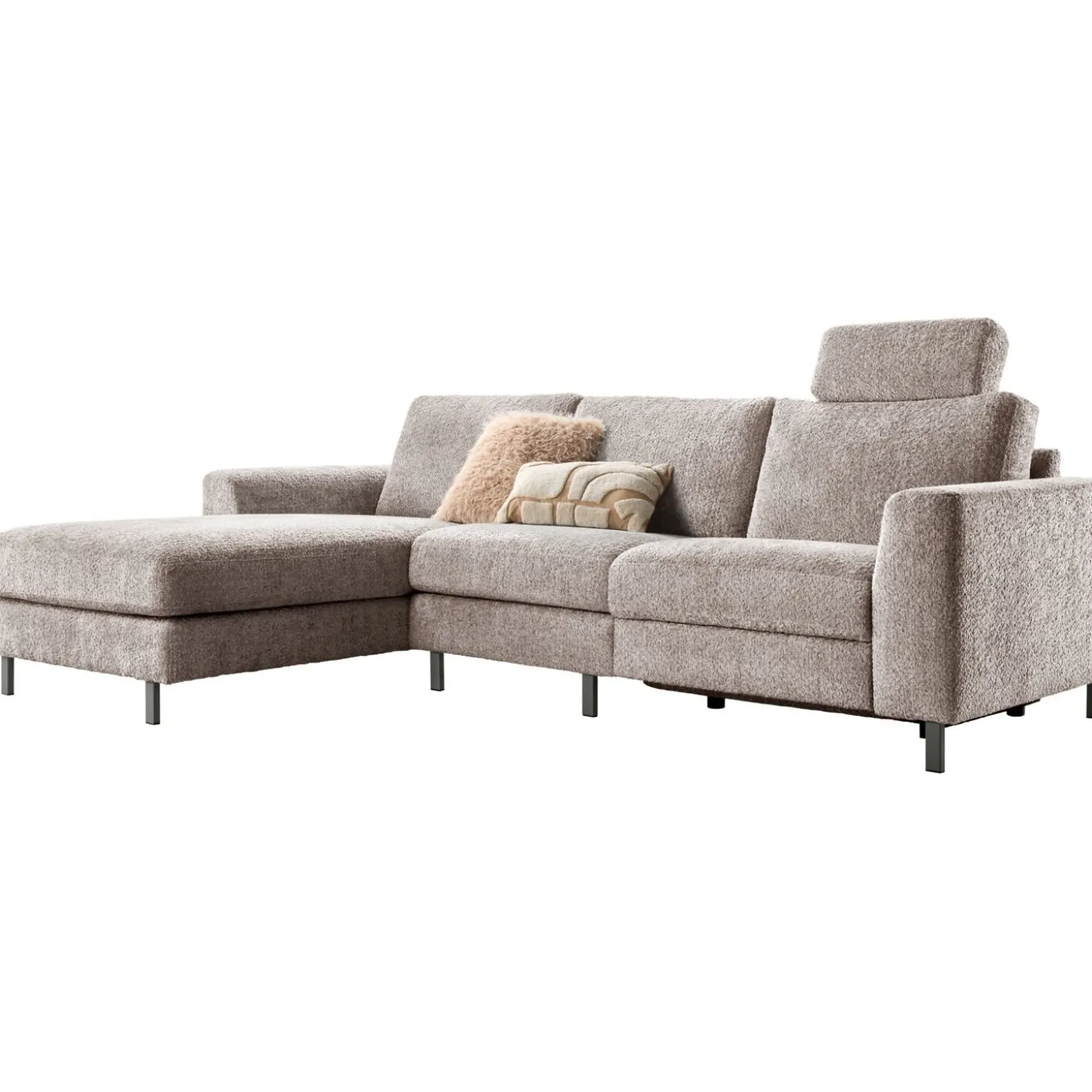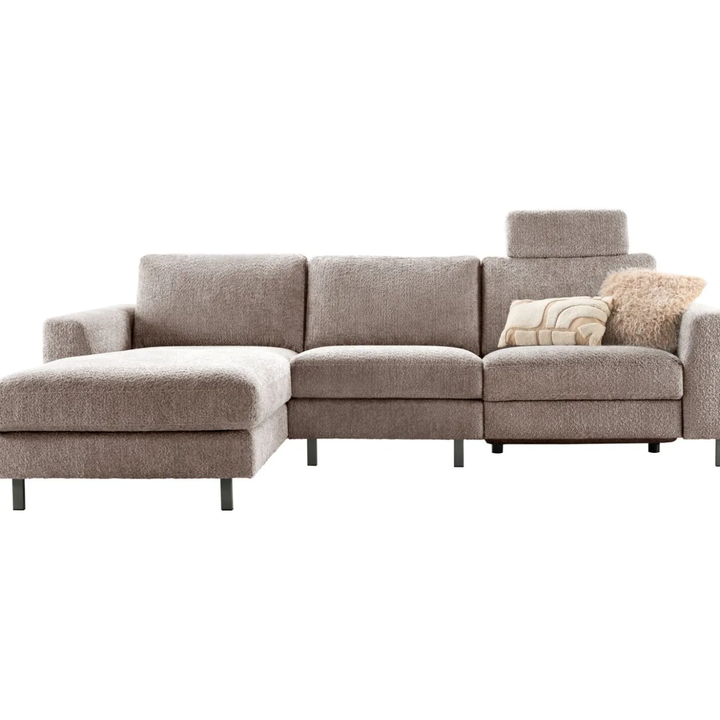 | Uitvoering | Longchair groot arm A links + 1 zits (80) zonder armen + 1 zits (80) arm A rechts met elektrische relaxfunctie en hoofdsteun 60 (met beugel in de kleur perle brown), uitgevoerd in stof venga 12-taupe met pocketvering op bonellvering met een toplaag van traagschuim in de zitting, HR-koudschuim met een toplaag van veren en siliconenvlokken in de rug en metalen poten type MF5 in de kleur perle brown (hoogte 12 cm). |