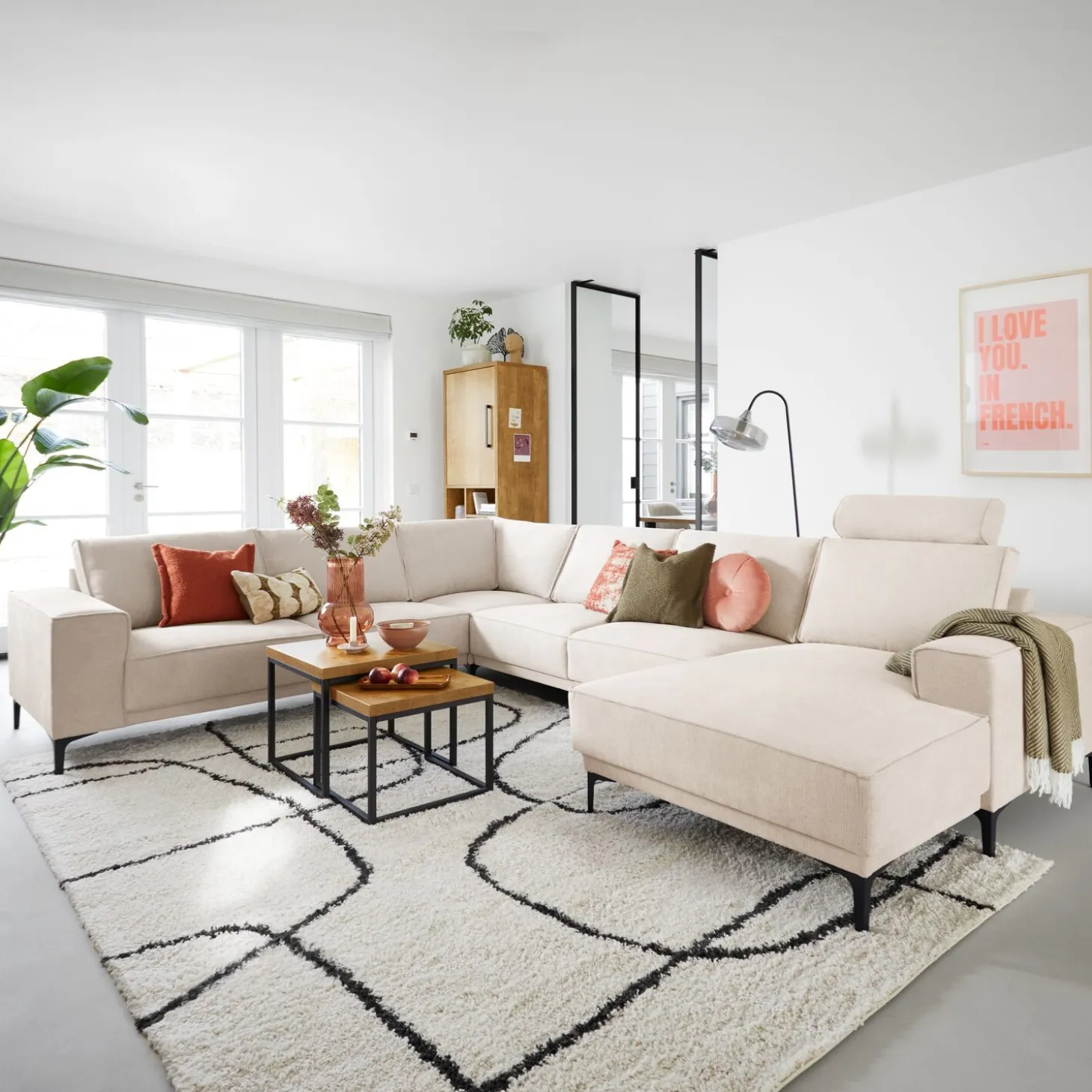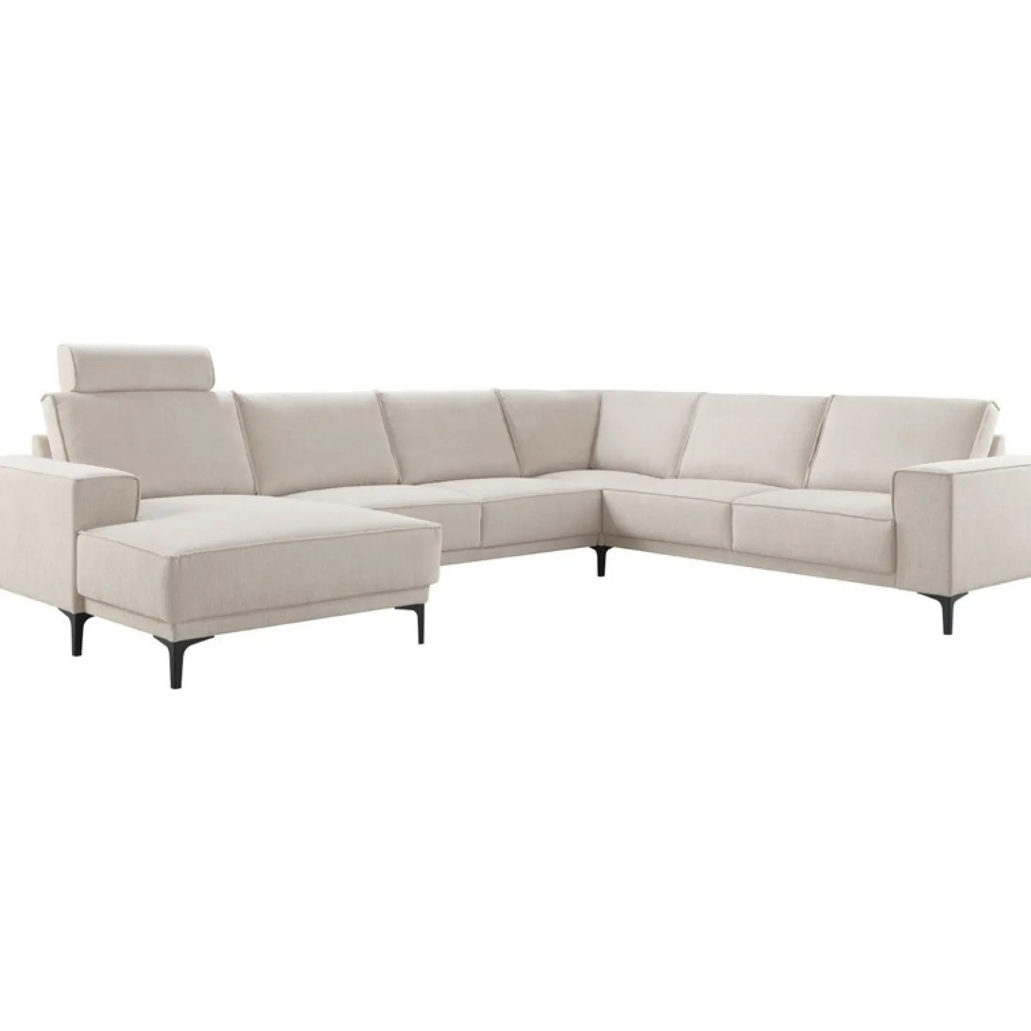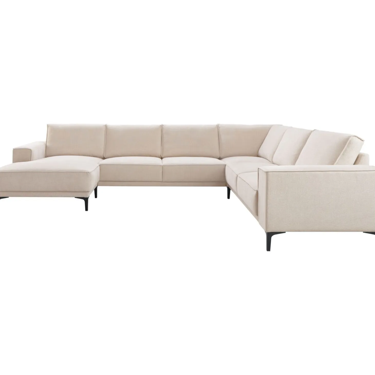 | Uitvoering | Longchair arm links + 2,5 zits zonder armen + hoek + 2,5 zits arm rechts in stof mito 01-natural met brede armleuning, polyetherschuim in de zitting, mix van polyetherschuim- en siliconenvlokken in de rug en zwarte T-poten type 12234 H-150. |