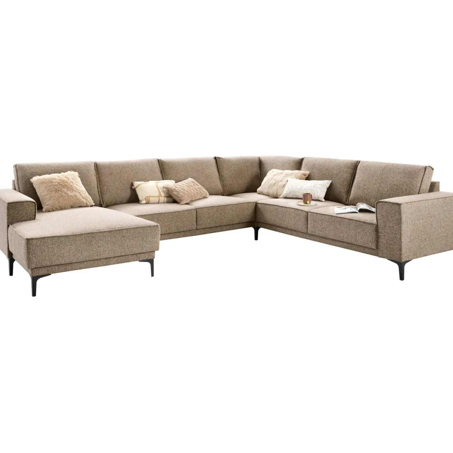 | Uitvoering | Longchair arm links + 2,5 zits zonder armen + hoek + 2,5 zits arm rechts in stof taurus 109-desert met brede armleuning, polyetherschuim in de zitting, mix van polyetherschuim- en siliconenvlokken in de rug en zwarte T-poten type 12234 H-150. |