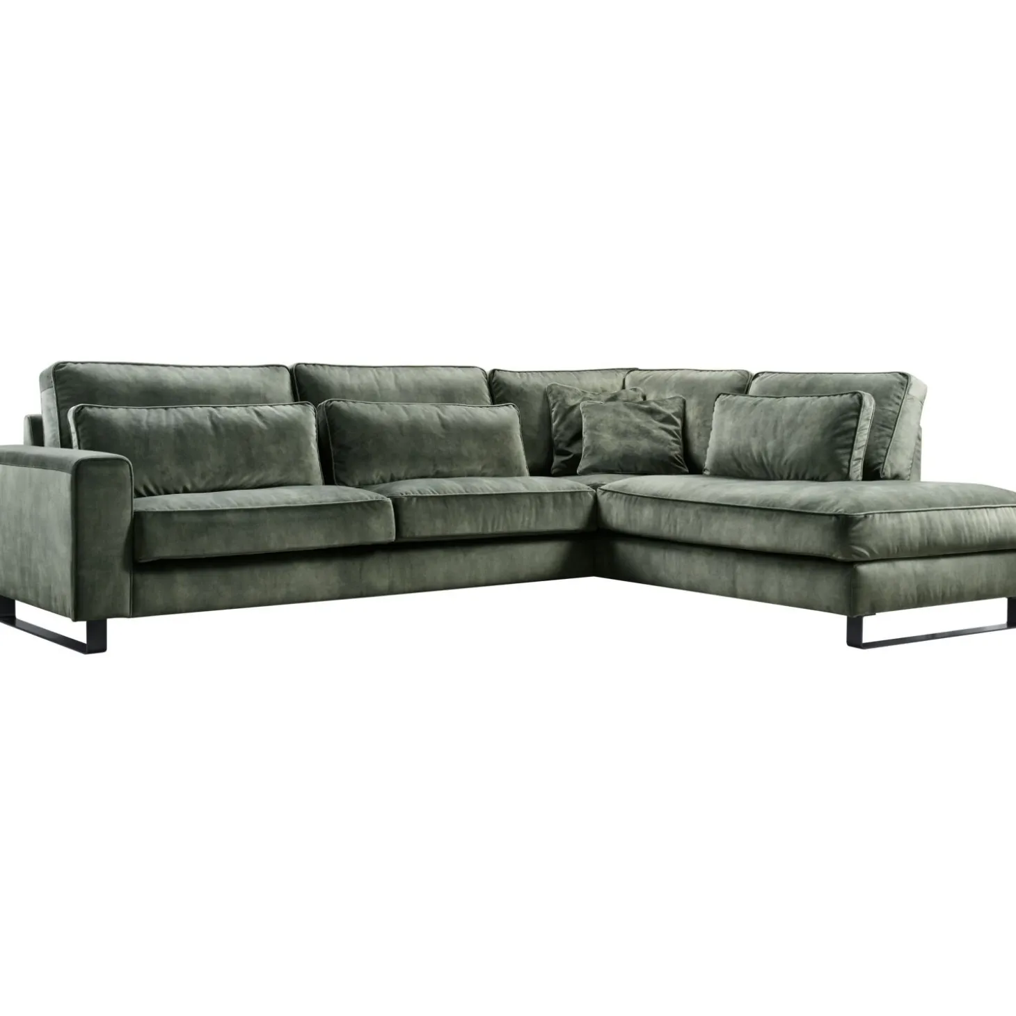 | Uitvoering | 2,5 zits arm links + hoek met eiland rechts, uitgevoerd in stof adore 156-hunter met bies in dezelfde stof, HR-koudschuim in de zitting, polyetherschuim in de rug 3 lendekussens 60×35 cm met bies, 2 sierkussens 45×45 cm met bies en zwart metalen sledepoten (13 cm). |