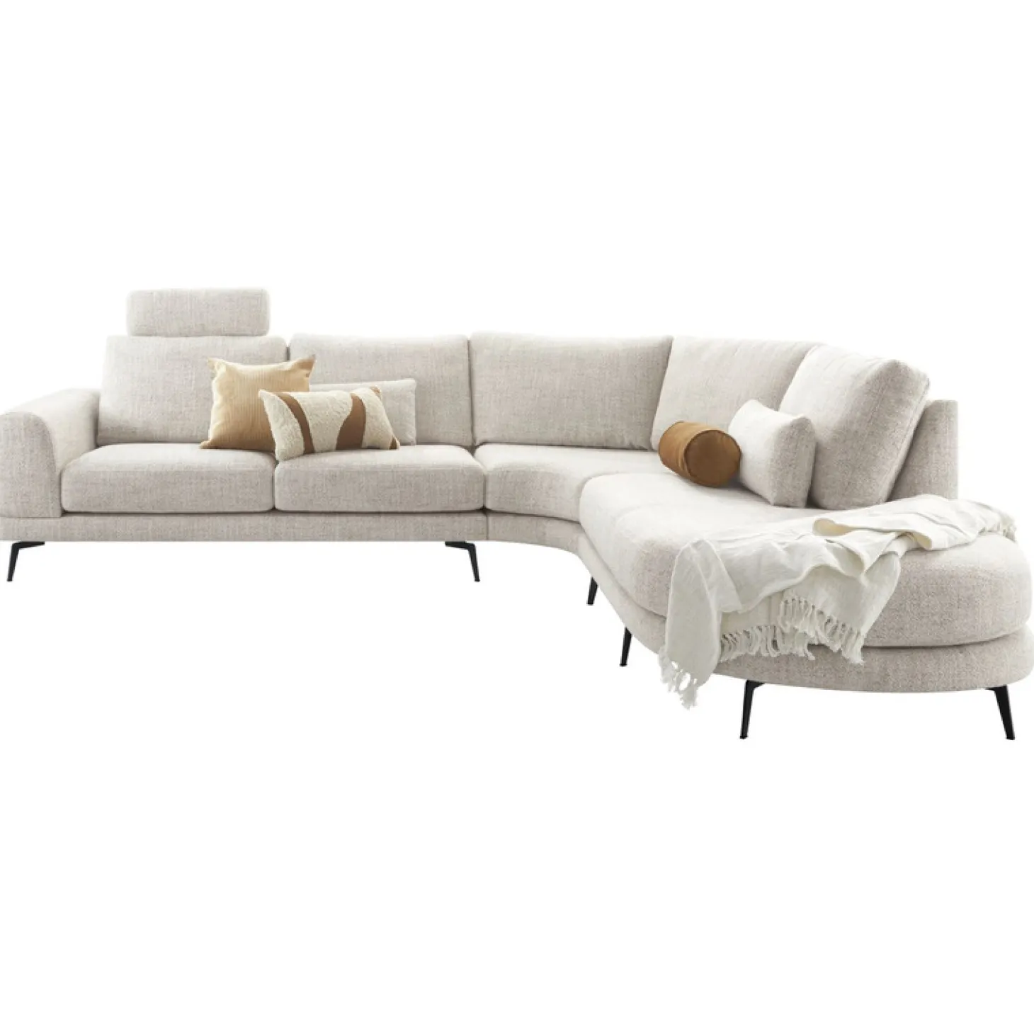 Model Flandria heeft een trendy uitstraling door zijn ronde vormgeving. De bank is bekleed in stof oasis. Dit is een geweven stof en is iets wat gemĂȘleerd, wat een leuk speels effect geeft. De zwart metalen poten maken deze trendy hoekbank helemaal af.