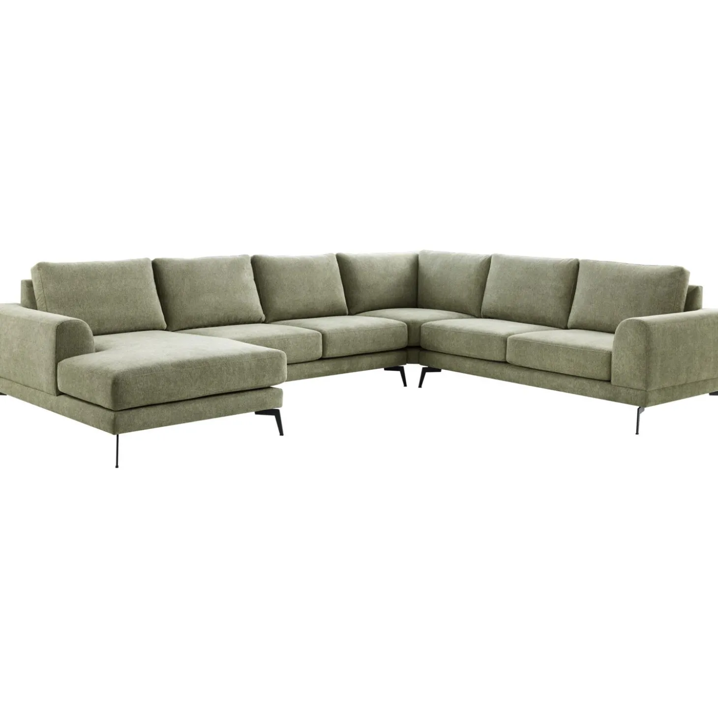 | Uitvoering | Longchair arm links + 2,5 zits zonder armen + hoekelement + 2,5 zits arm rechts uitgevoerd in stof mito 55-green met polyetherschuim met een toplaag van HR-koudschuim in de zitting, mix van polyetherschuim- en siliconenvlokken in de rug en zwarte metalen poten, type M-15 (15 cm). |
