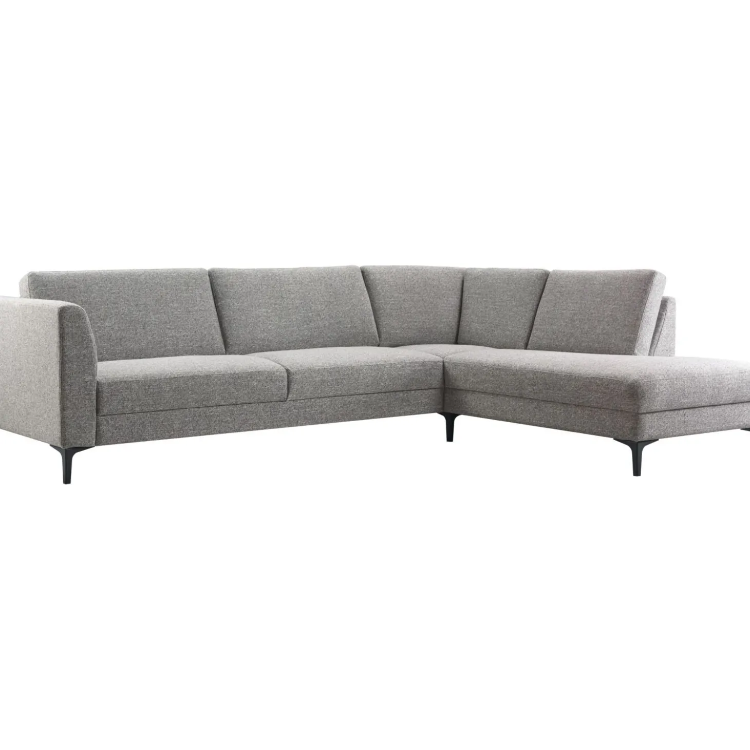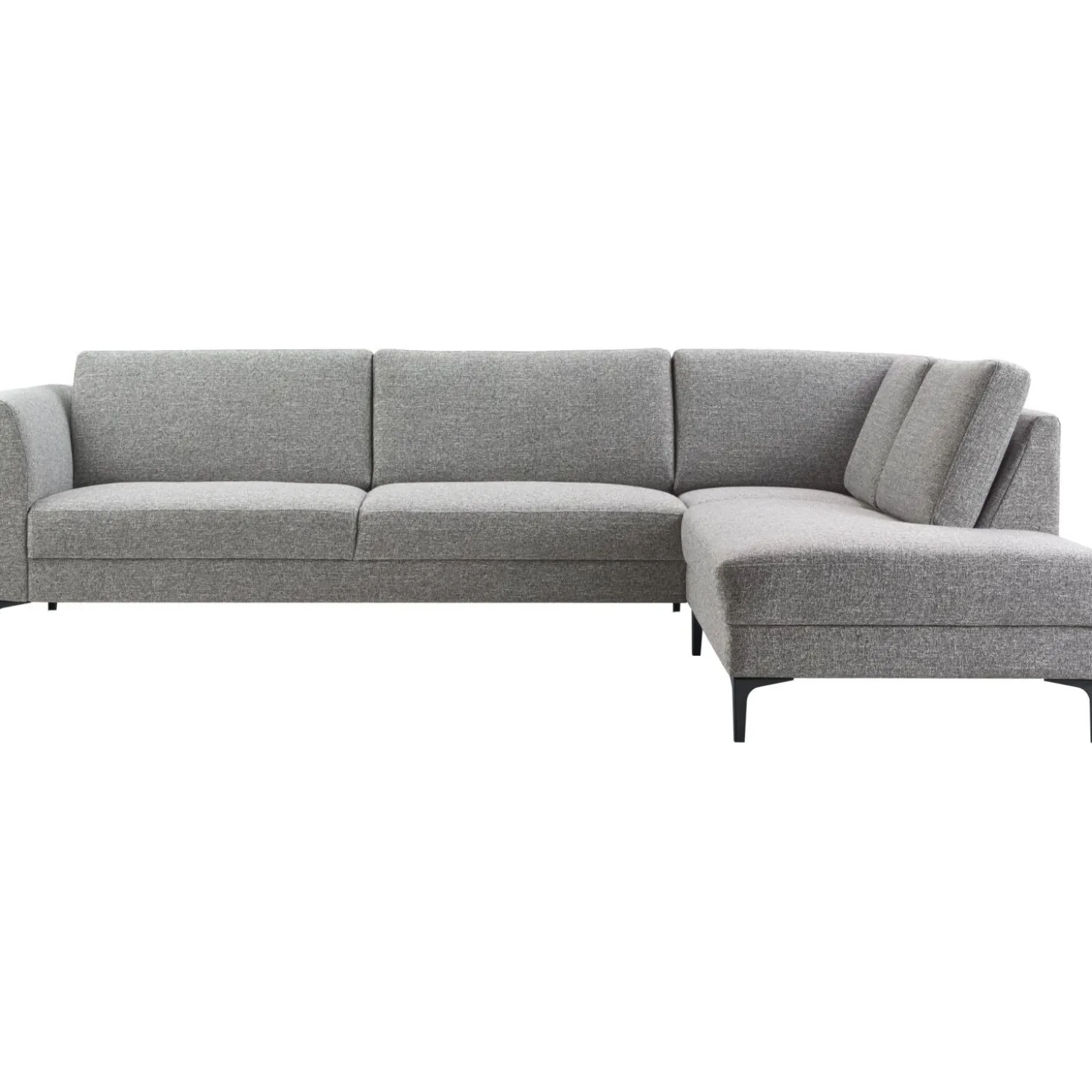 | Uitvoering | 3 zits arm links + hoek met eiland rechts uitgevoerd in stof oasis 65-grey met HR-koudschuim in de zitting, HR-koudschuim in de rug en zwarte metalen T-poot type 12234 H-150. |