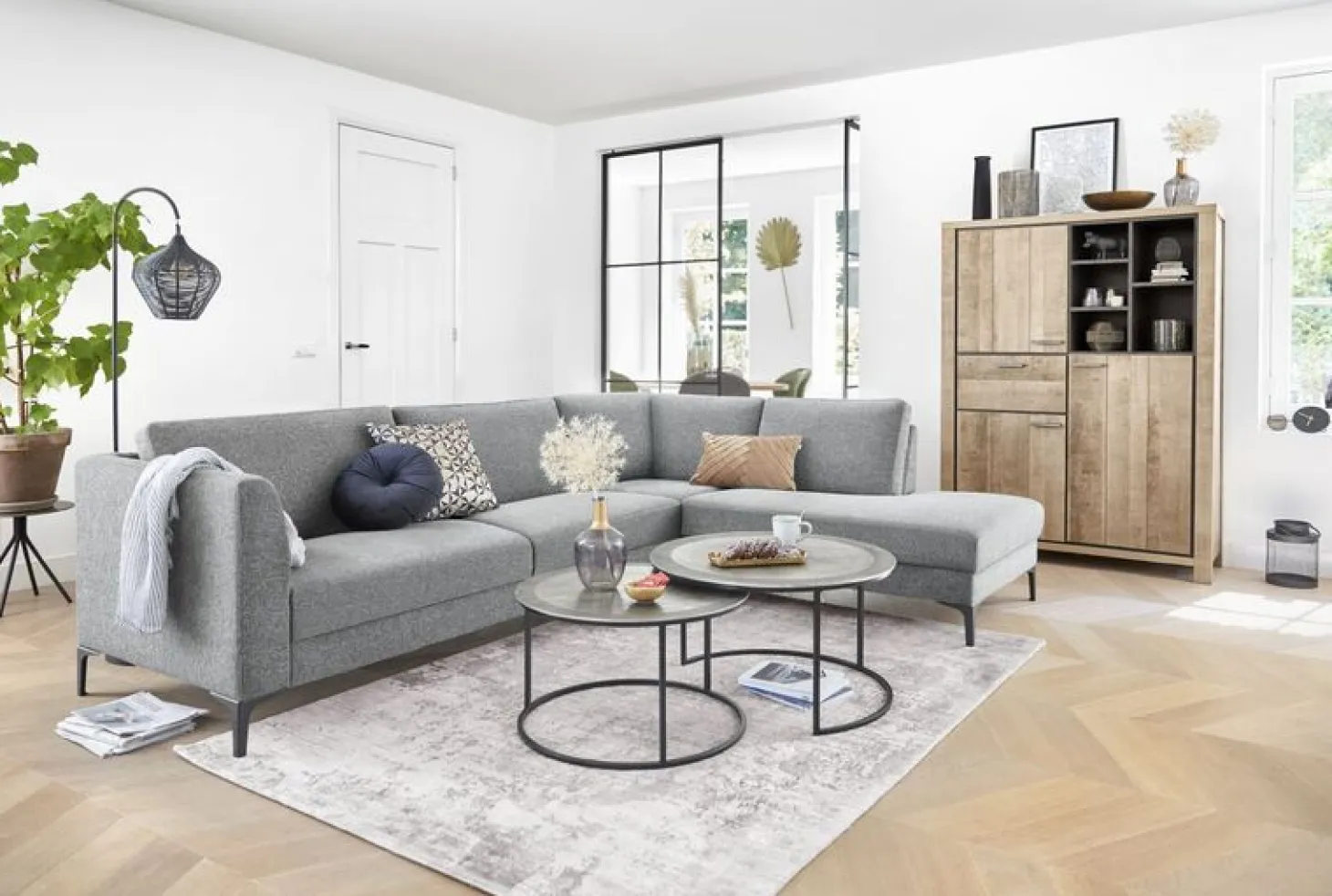 Hoekbank Gulnare is een ranke, strak vormgegeven hoekbank die zich in vrijwel ieder interieur thuis voelt. De bank is bekleed met een gemêleerde stof. Door het gebruik van verschillende garens en tinten grijs, ontstaat een wat grovere geweven structuur die zacht aanvoelt en de bank een elegante, warme uitstraling geeft. De zwart metalen poten zijn 15 cm hoog en maken de bank helemaal af.