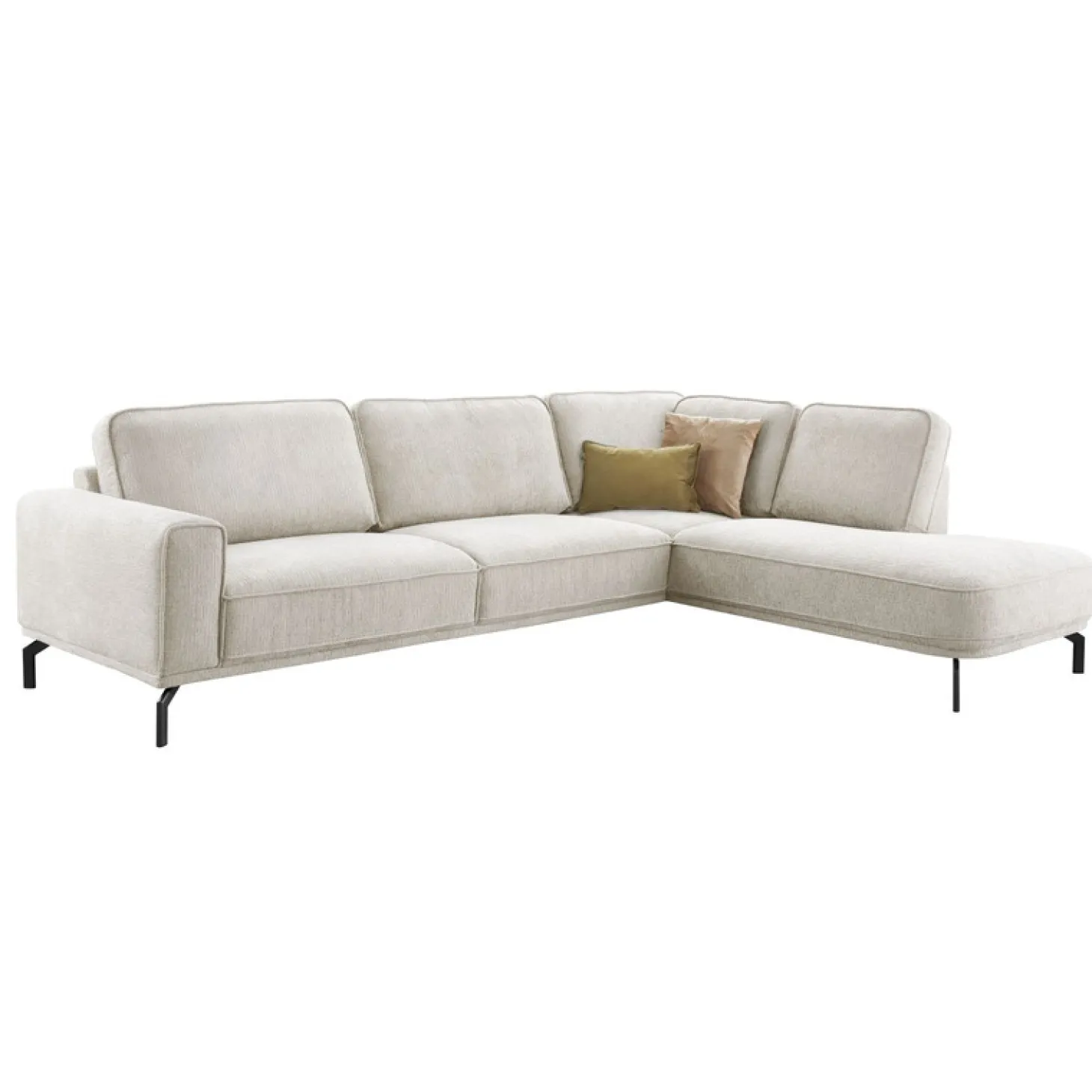 Transformeer je woonruimte in een oase van comfort en stijl met onze hoekbank Loretio. De zachte, rondere belijning van deze bank omarmt je als een warme omhelzing, perfect voor gezellige momenten met vrienden of rustige avonden alleen. De bank is bekleed in de beige weefstof fusion. Fusion is een zware en stevige kwaliteit meubelstof met een licht 3D effect. De stof heeft een volumineuze en luxe uitstraling en voelt zacht aan. De naden zijn standaard afgewerkt met een gesloten vlindernaad, waardoor de zachte, rondere belijning extra wordt geaccentueerd. De moderne metalen poten maken deze bank super stijlvol en past hierdoor perfect in een moderne woonkamer. Deze bank biedt voldoende zitruimte voor jou, je familie en vrienden, zodat jullie samen kunnen genieten van gezellige avonden en ontspannen momenten.