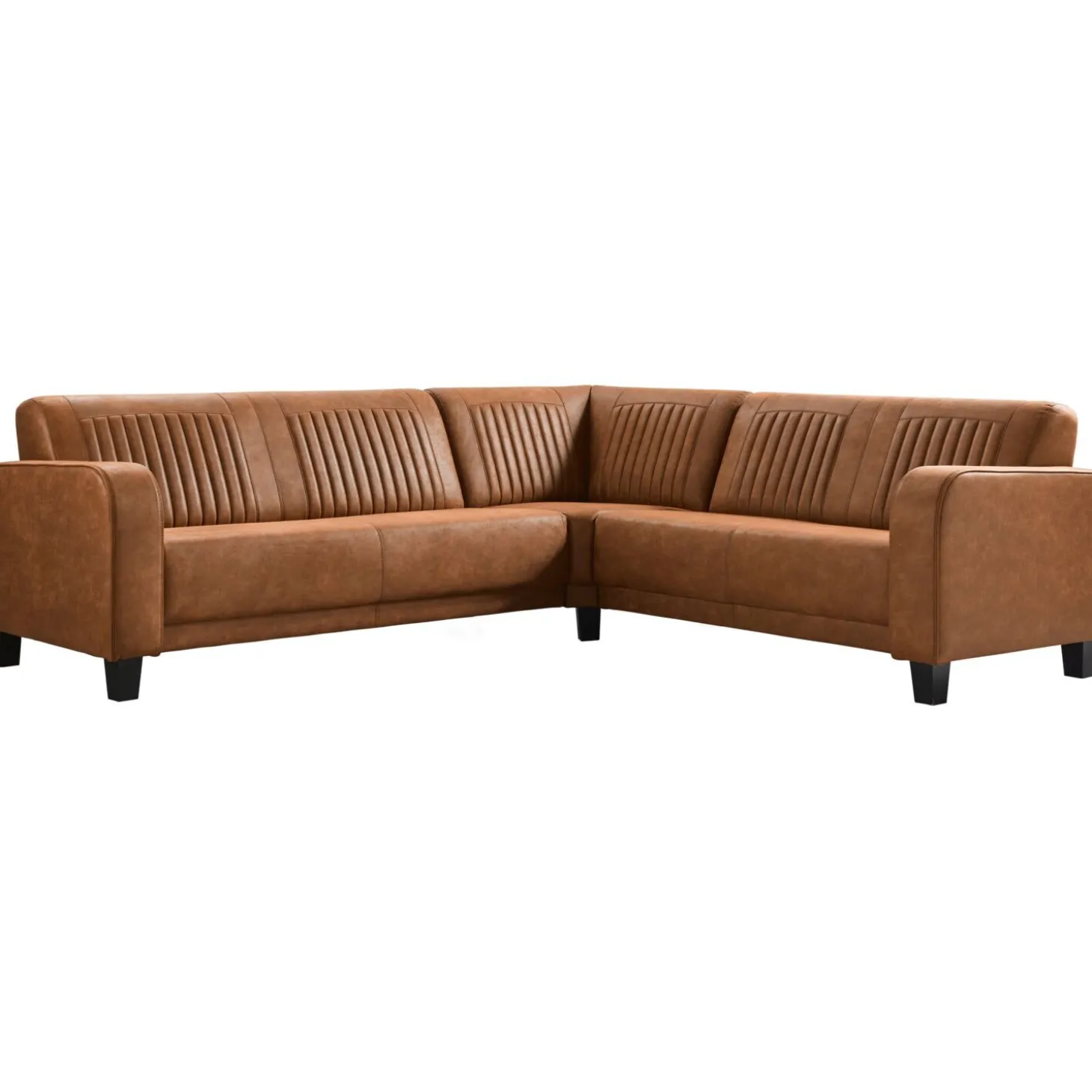 | Uitvoering | 2,5 zits arm links + grote hoek + 2 zits arm rechts, uitgevoerd in microleder bull 28-cognac met bies in microleder bull 28-cognac, polyetherschuim in de zitting, polyetherschuim in de rug en zwarte houten poot type UNS (15 cm). |