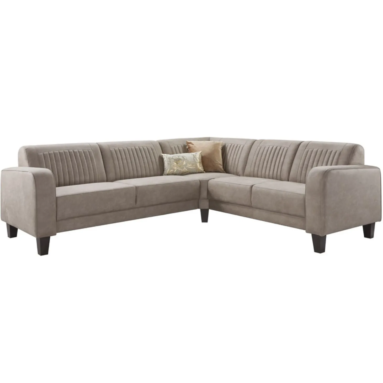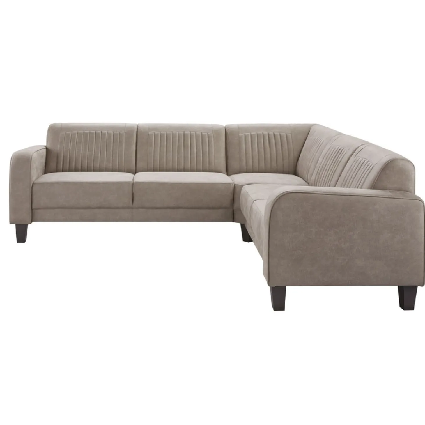 | Uitvoering | 2,5 zits arm links + grote hoek + 2 zits arm rechts, uitgevoerd in microleder bull 84-clay met bies in microleder bull 84-clay, polyetherschuim in de zitting, polyetherschuim in de rug en koloniaal houten poot type UNS (15 cm). |