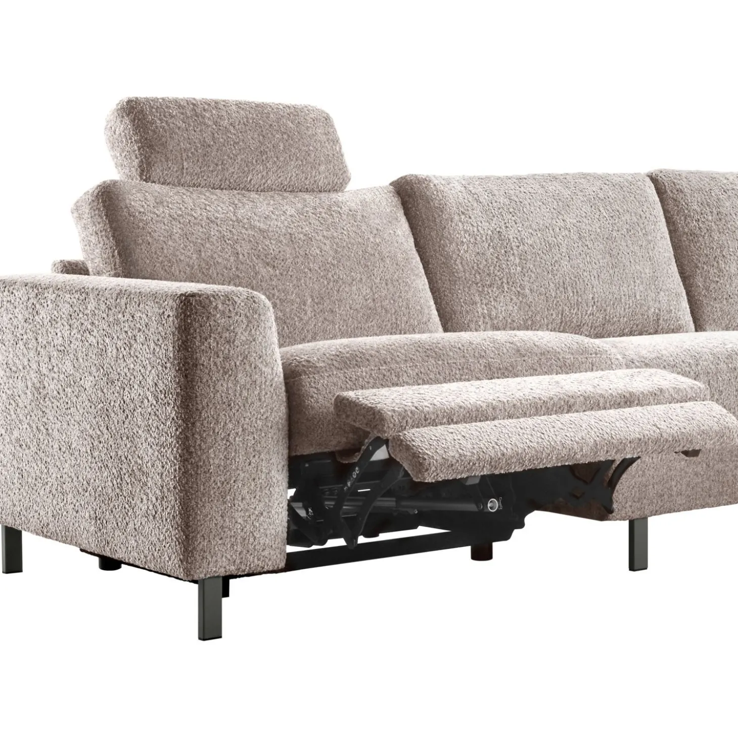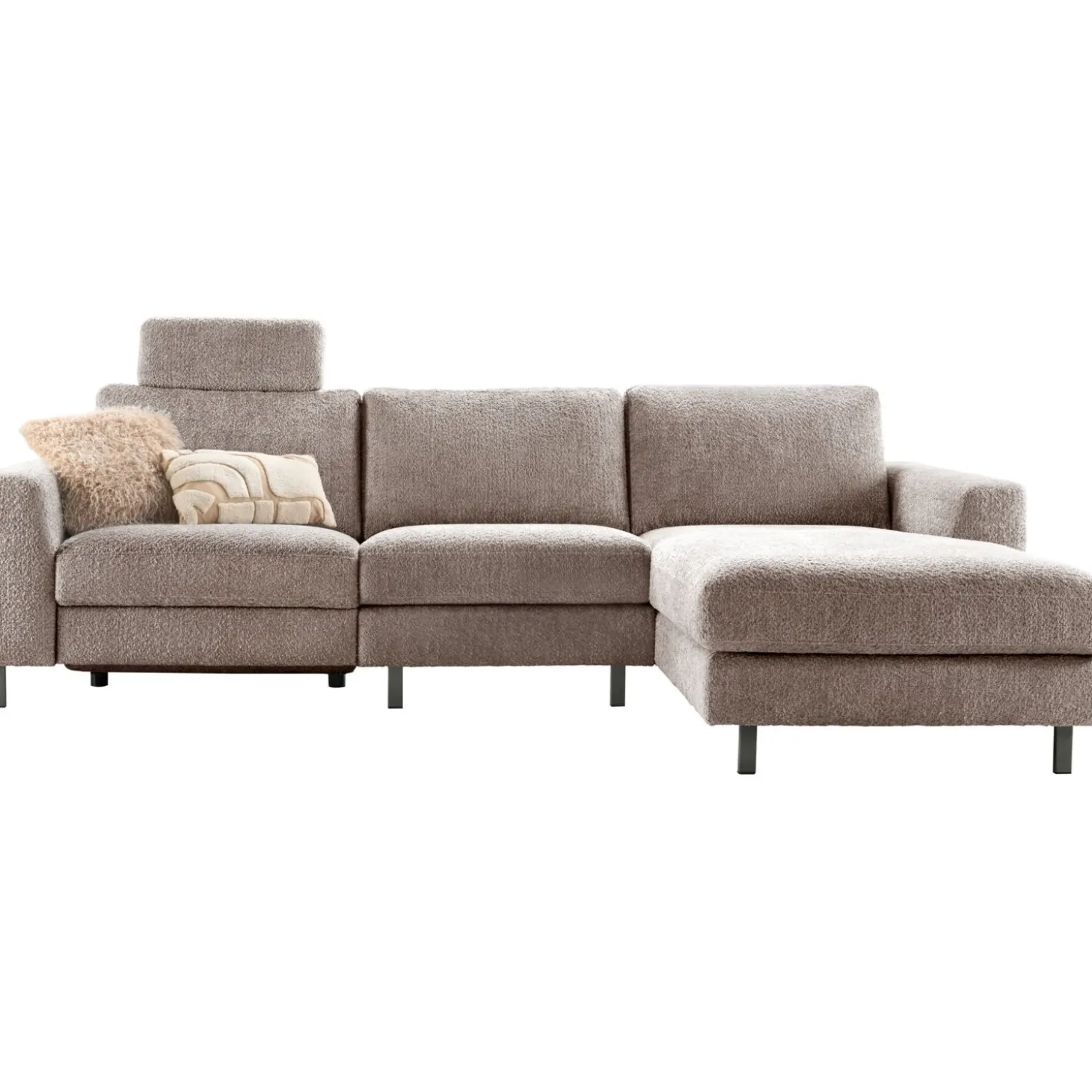 | Uitvoering | 1 zits (80) arm A links met elektrische relaxfunctie en hoofdsteun 60 (met beugel in de kleur perle brown) + 1 zits (80) zonder armen + chaise longue groot arm A rechts, uitgevoerd in stof venga 12-taupe met pocketvering op bonellvering met een toplaag van traagschuim in de zitting, HR-koudschuim met een toplaag van veren en siliconenvlokken in de rug en metalen poten type MF5 in de kleur perle brown (hoogte 12 cm). |