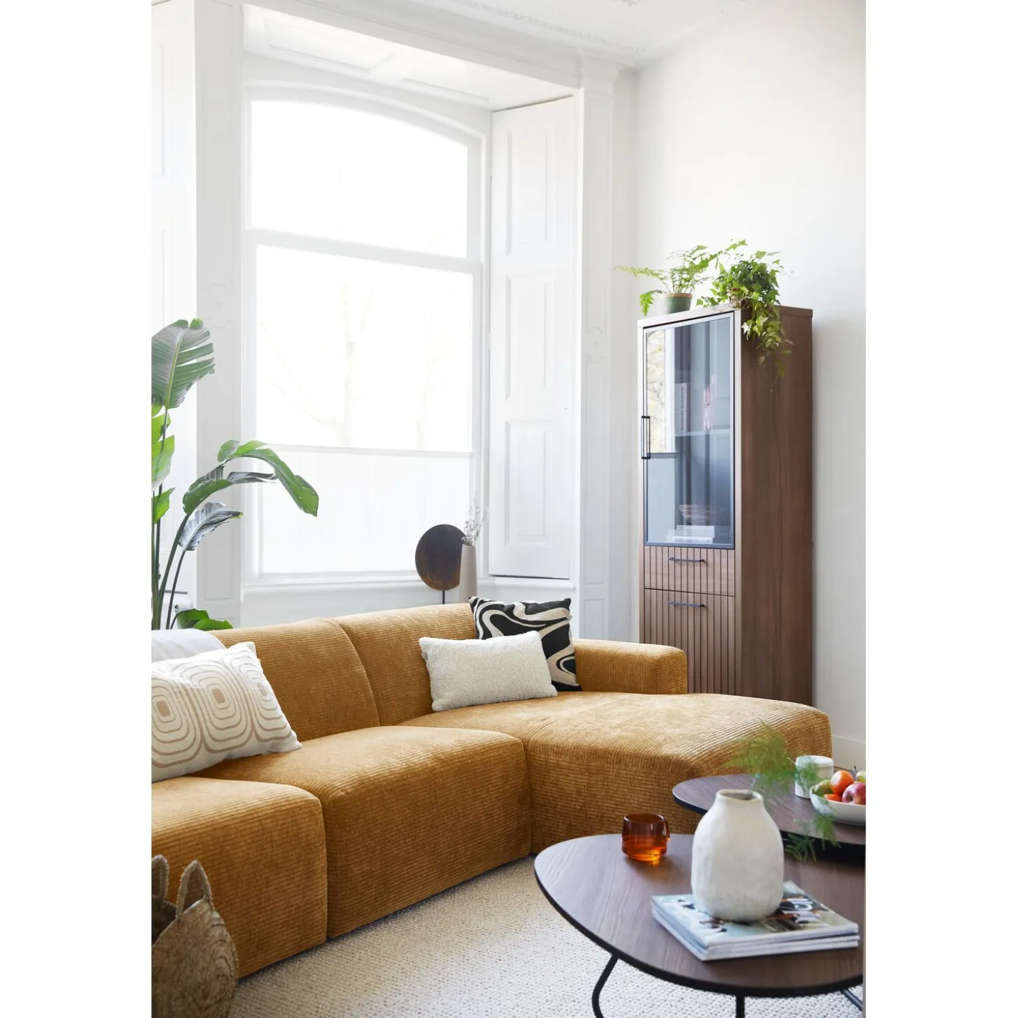 Elementenbank Romont is met zijn strakke vormgeving en elementen in verschillende stoffen/kleuren een echte eyecatcher in je woonkamer. De elementen met de opvallende geel/bruine kleur zijn uitgevoerd in een trendy ribstof die horizontaal is gestoffeerd.