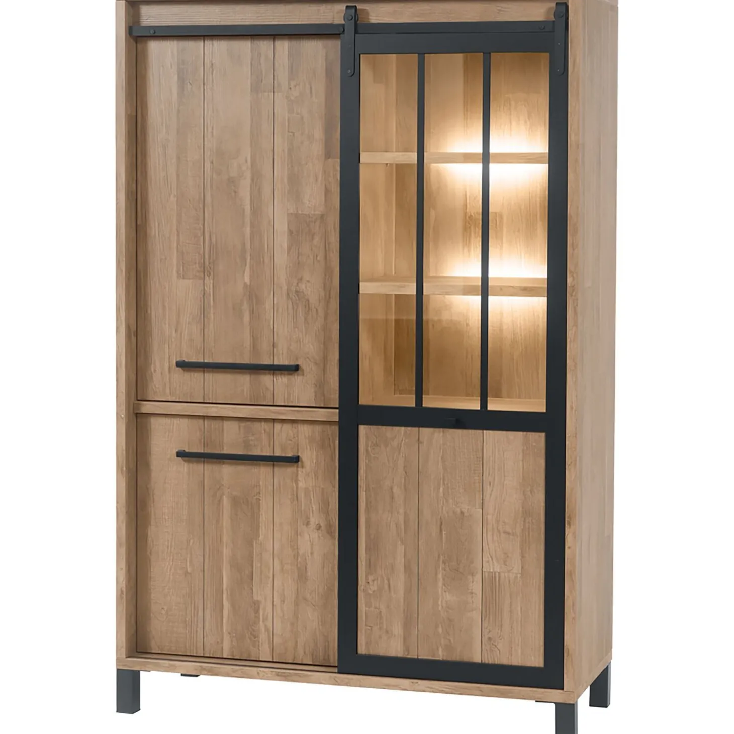 De Alva kast heeft links 2 deuren met softclose, waardoor deze automatisch zachtjes dichtvallen. Achter de onderste deur zit 1 vaste legplank, achter de bovenste deur bevinden zich 2 vaste legplanken. Rechts zit een schuifdeur met glazen ruitjes die zowel aan de boven- als de onderzijde door een rails loopt. Onder de twee legplanken die je door de ruitjes van de schuifdeur ziet, zit sfeervolle LED verlichting.