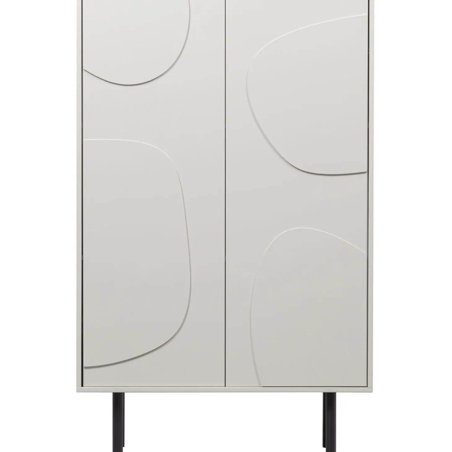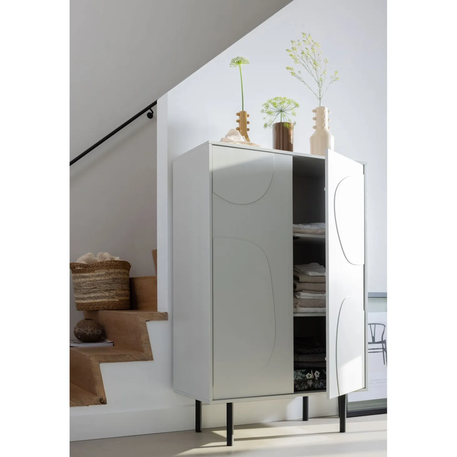 Opbergkast Atri heeft een clean design, speels houtpatroon en een sprekend kleurcontrast. De mistwitte afwerking houdt het ontwerp stijlvol en modern met als spannende tegenhanger de stoere, stevige zwarte poten. Kortom, een echte eyecatcher voor in je interieur! De kast is gemaakt van grenenhout.